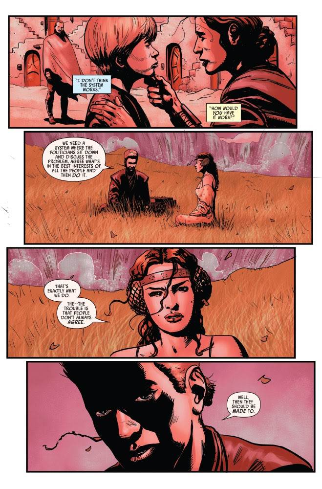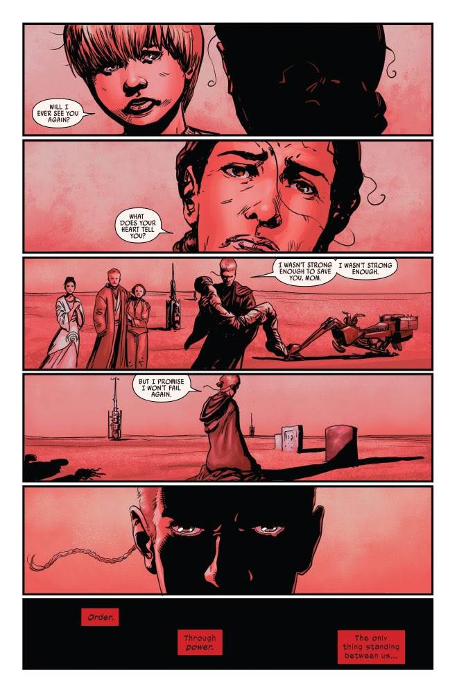 Writer Greg Pak and artist Giui Vilanova open Darth Vader #19 with more red-tinged flashbacks to Anakin’s youth. We see the young Force-user saying farewell to his mother and conversing about politics later on with his eventual wife Padmé Amidala, in recreations of scenes straight out of the Star Wars prequel trilogy.