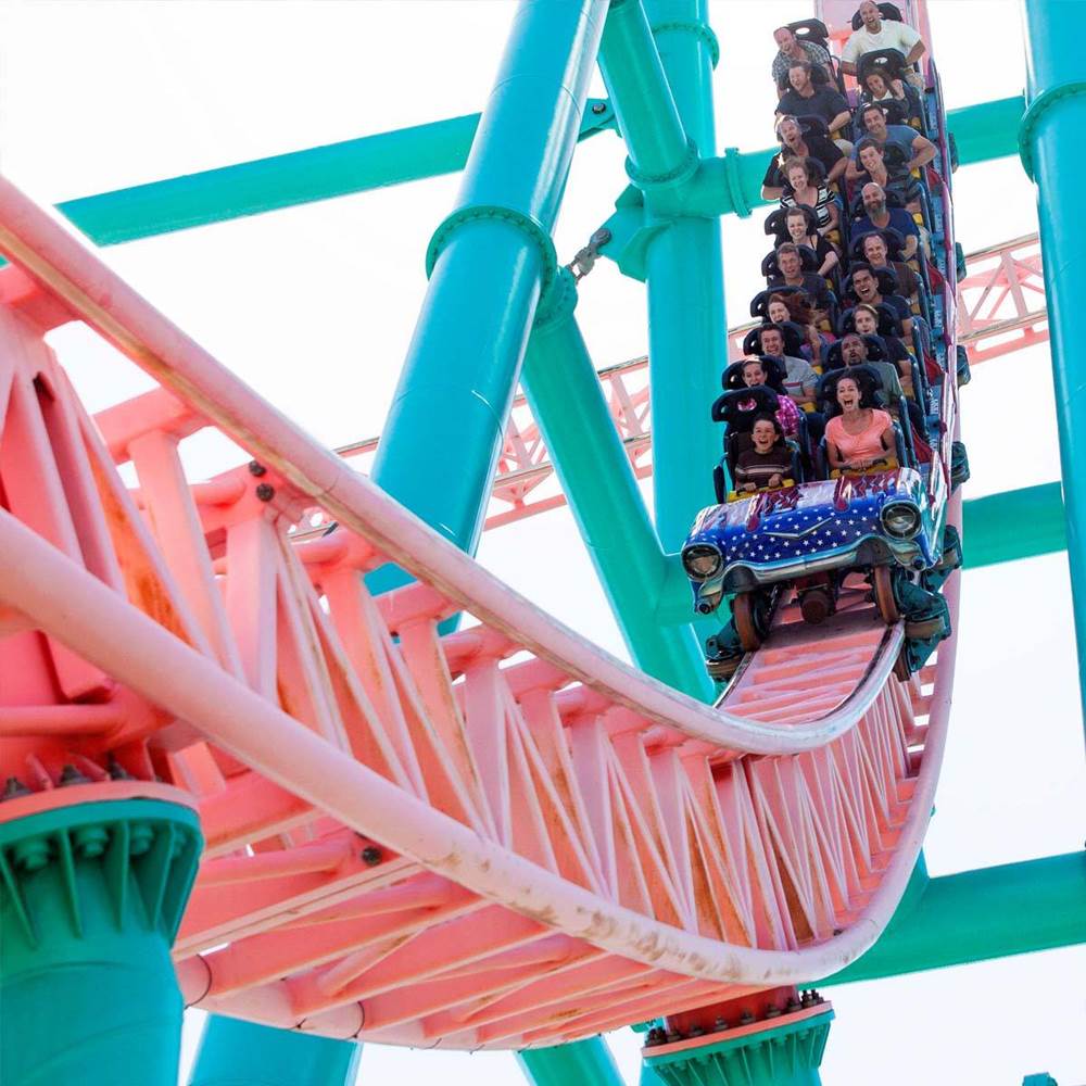 Montezooma’s Revenge is a Knott’s classic and the last of its kind operating in North America. Opening in 1978, it uses a flywheel launch system to catapult riders up to 55 mph in 3 seconds through a vertical loop forwards and backwards, and up two near vertical spikes. Sure it’s a one-trick pony, but the trick it offers is still an intense and smooth ride over 40 years later.