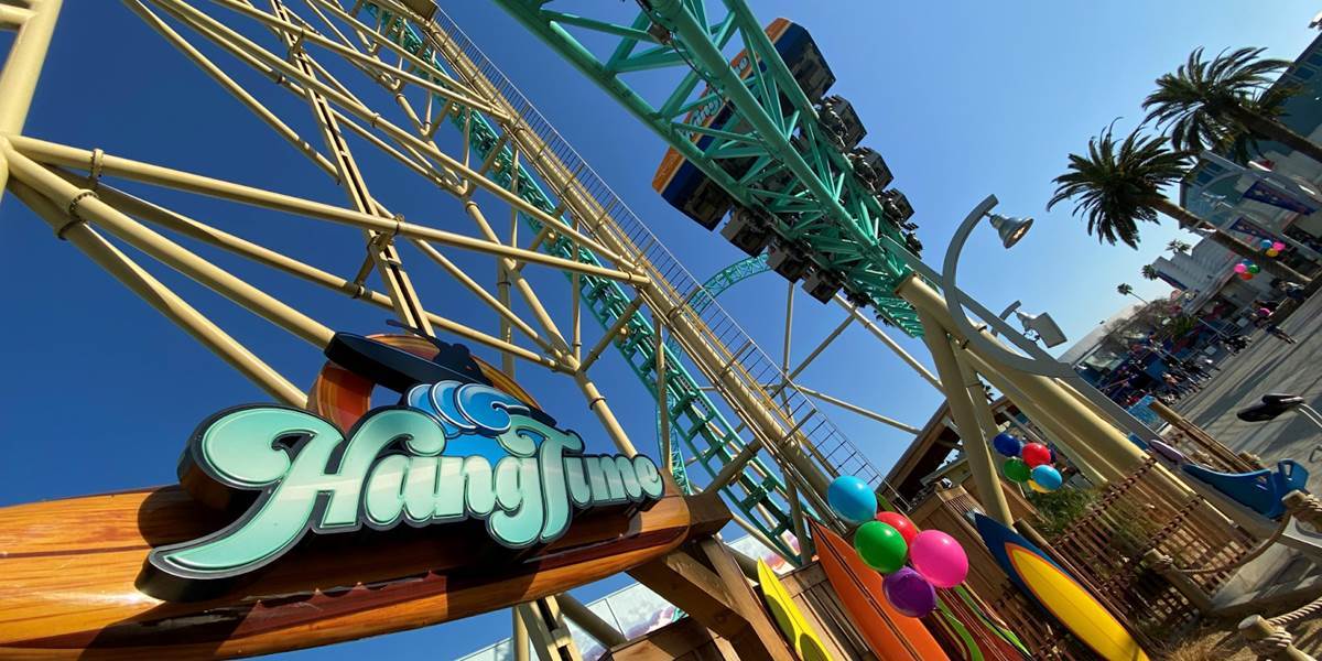 The newest roller coaster at Knott’s Berry Farm is HangTime, a rather compact looping coaster that took over for the park’s former Boomerang. The main gimmick of HangTime is the vertical lift hill, followed by a pause at the top, before you plunge down a 96 degree beyond-vertical drop. If you’ve never experienced a vertical lift hill or holding brake, then be forewarned that the experience is very strange. After a powerful first drop, the rest of the ride is filled with great moments of hang-time (hence the name), along with one really good air-time moment. HangTime is also complimented by an excellent lighting package at night, which is often timed along to the music in the Boardwalk area.