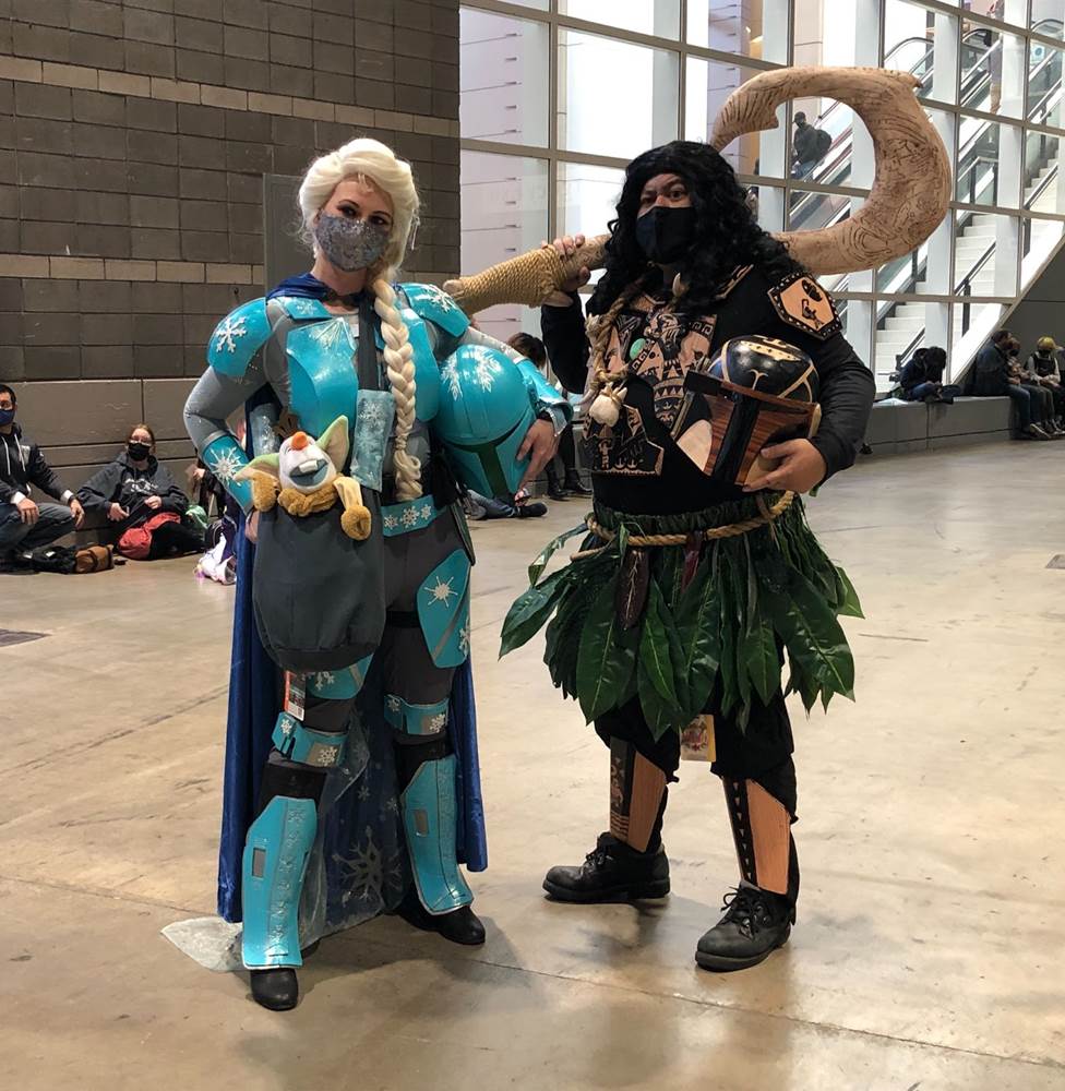 Queen Elsa (Frozen) became pals with demigod Maui (Moana) and both decided to see what it was like to live the Mandalorian life. Elsa even has her own Asset: Olaf dressed as Grogu!
