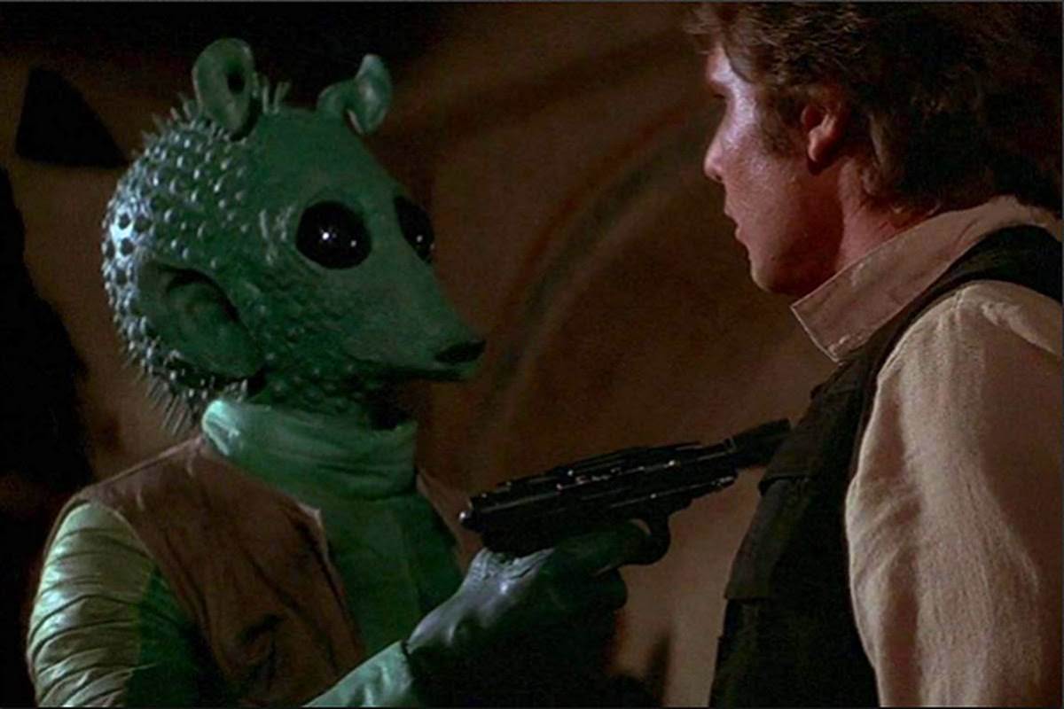 34 - Huttese Insults: The Rodian uses the terms “sleemo” and “poodoo,” both of which we’ve heard before– according to Wookieepedia, “sleemo” (Anakin calls Sebulba this in The Phantom Menace) roughly translates to “slimeball,” and poodoo (said by Jabba the Hutt in Return of the Jedi)… well, let’s just say that’s a topic that’s been hotly debated among the Star Wars fan community.