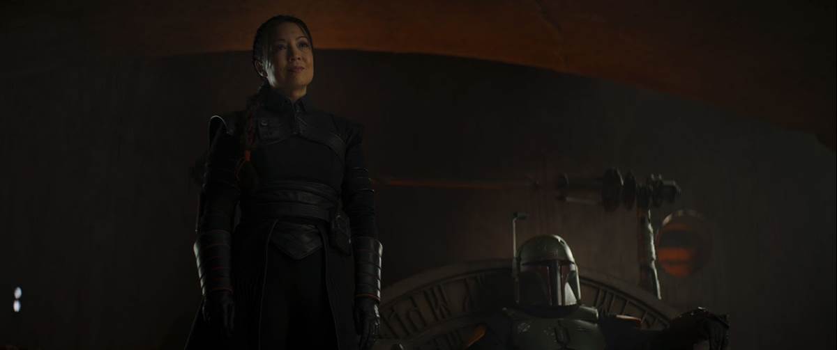 We see Boba Fett throwing his weight around Mos Espa (who knew this settlement first seen in The Phantom Menace was located inside a giant crater?) with the help of his new right-hand cyborg assassin Fennec Shand (Ming-Na Wen, reprising the role from The Mandalorian and Star Wars: The Bad Batch). We also pretty much immediately get some satisfying flashbacks to Fett’s tooth-and-nail survival of the Sarlacc Pit post-Jedi, thanks to bacta tank-induced nightmares. And the remainder of the episode follows that pattern that I’m guessing we’ll see more of in the weeks to come: filling in the gaps in Boba’s life between Episode VI and his appearance in The Mandalorian, while intermittently furthering the “present day” story. After meeting up with a Twi’lek entrepreneur (Jennifer Beals of Flashdance fame), Fett and Shand are jumped by a group of highly coordinated warriors– there have been plenty of theories floating around about these guys since they appeared in The Book of Boba Fett’s trailer, but we don’t get too much information about them just yet.