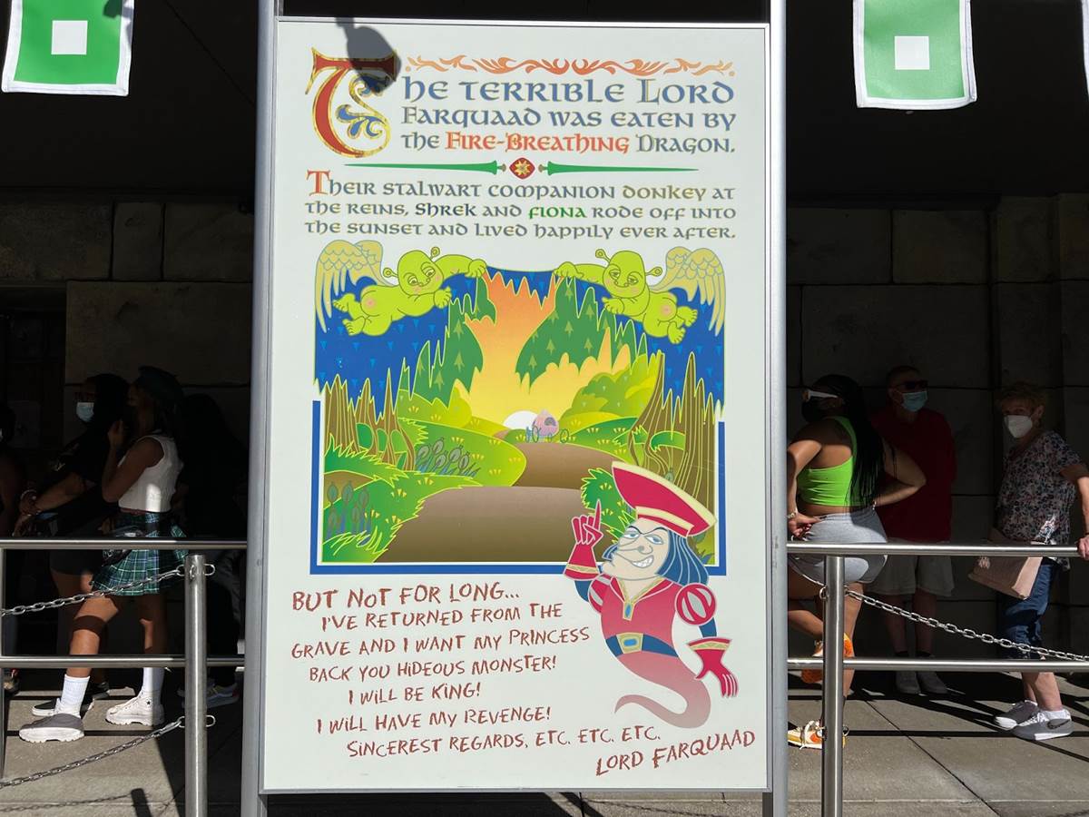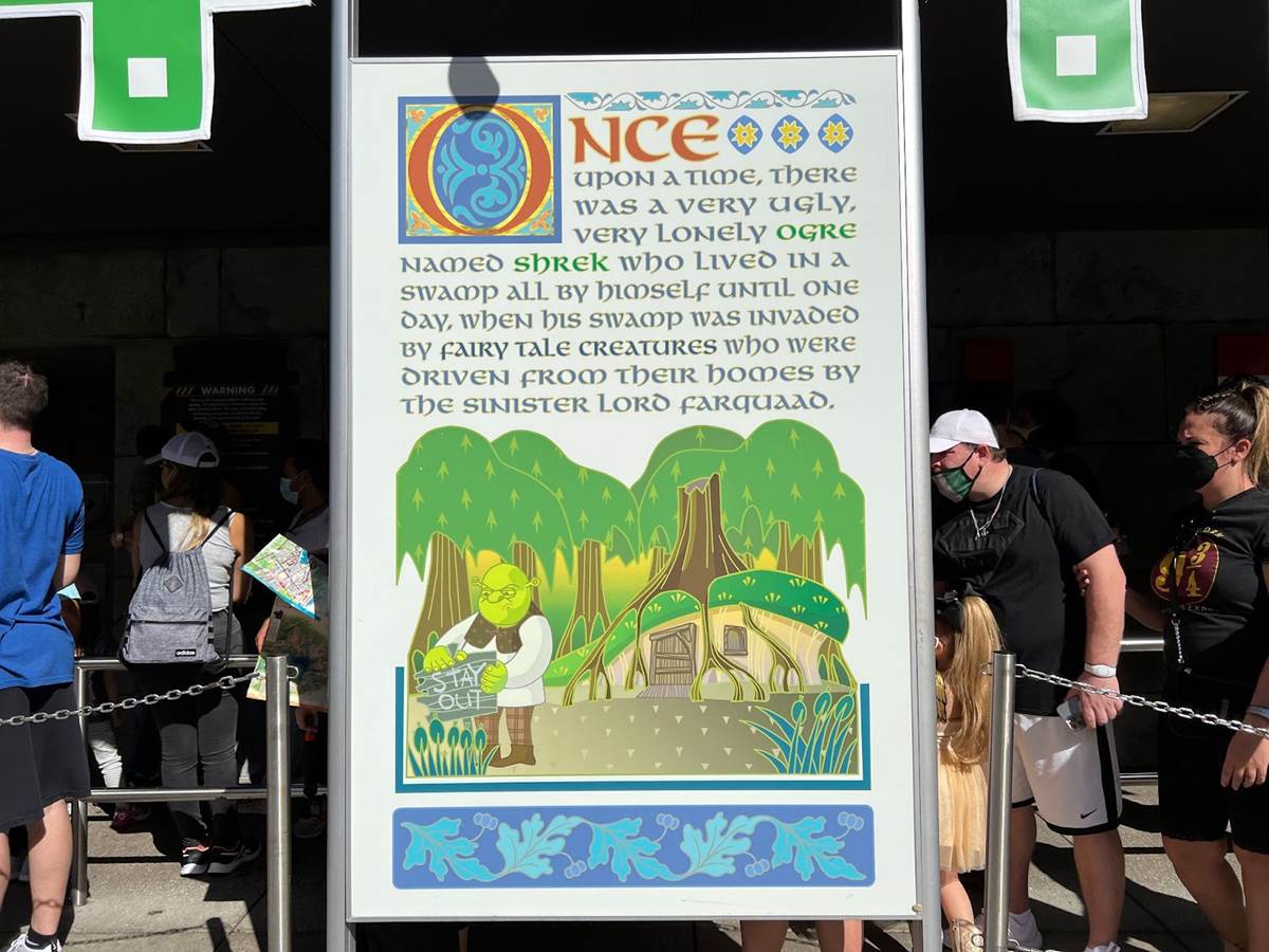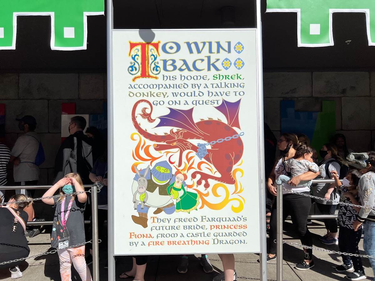 A highlight of the queue for Disney fans could be found on the backside of these pages, homages to classic Disneyland attractions with Shrek characters.