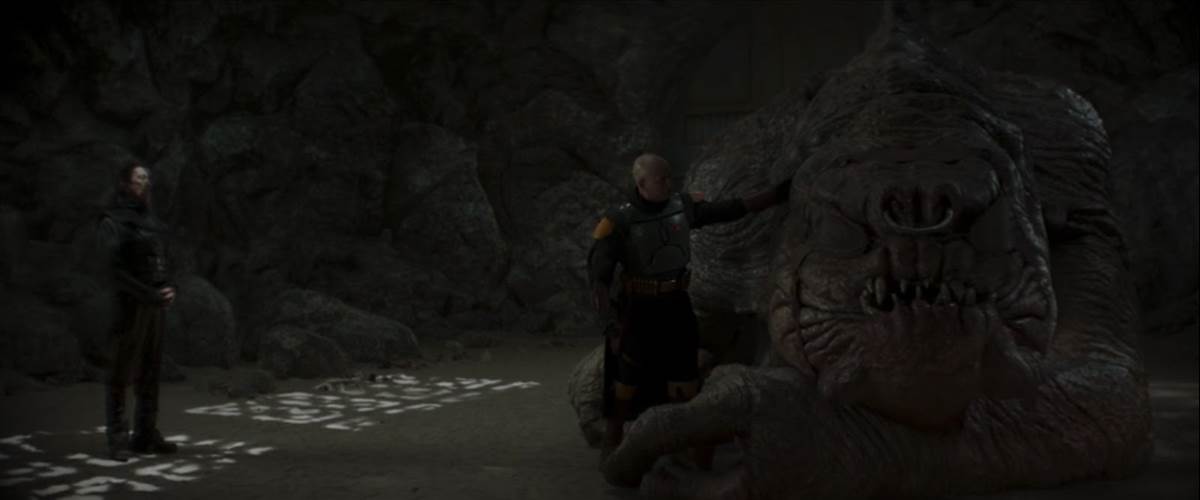 Then it’s flashback time, and in the past Boba Fett heads out to Mos Eisley in an effort to deal with the ongoing threat of the Pyke Syndicate, but returns to camp to find that his Tusken Raider friends have been slaughtered while he was away. Back in the present, our antihero is torn from his bacta pod by the fearsome Wookiee bounty hunter Black Krrsantan (Carey Jones) and a no-holds-barred battle ensues in Jabba’s Palace. Eventually Boba’s hired help comes to his aid and the Wookiee is captured, leading to another confrontation with the Hutts, who surprisingly apologize and tell Fett they’re leaving Tatooine because Mos Espa has been promised to another criminal organization– but not before gifting him with a replacement for the Rancor creature killed by Luke Skywalker in Return of the Jedi. The Rancor apparently comes with a complimentary Danny Trejo as trainer, and Fett declares his intention to learn how to ride the powerful beast before the end of the season.
