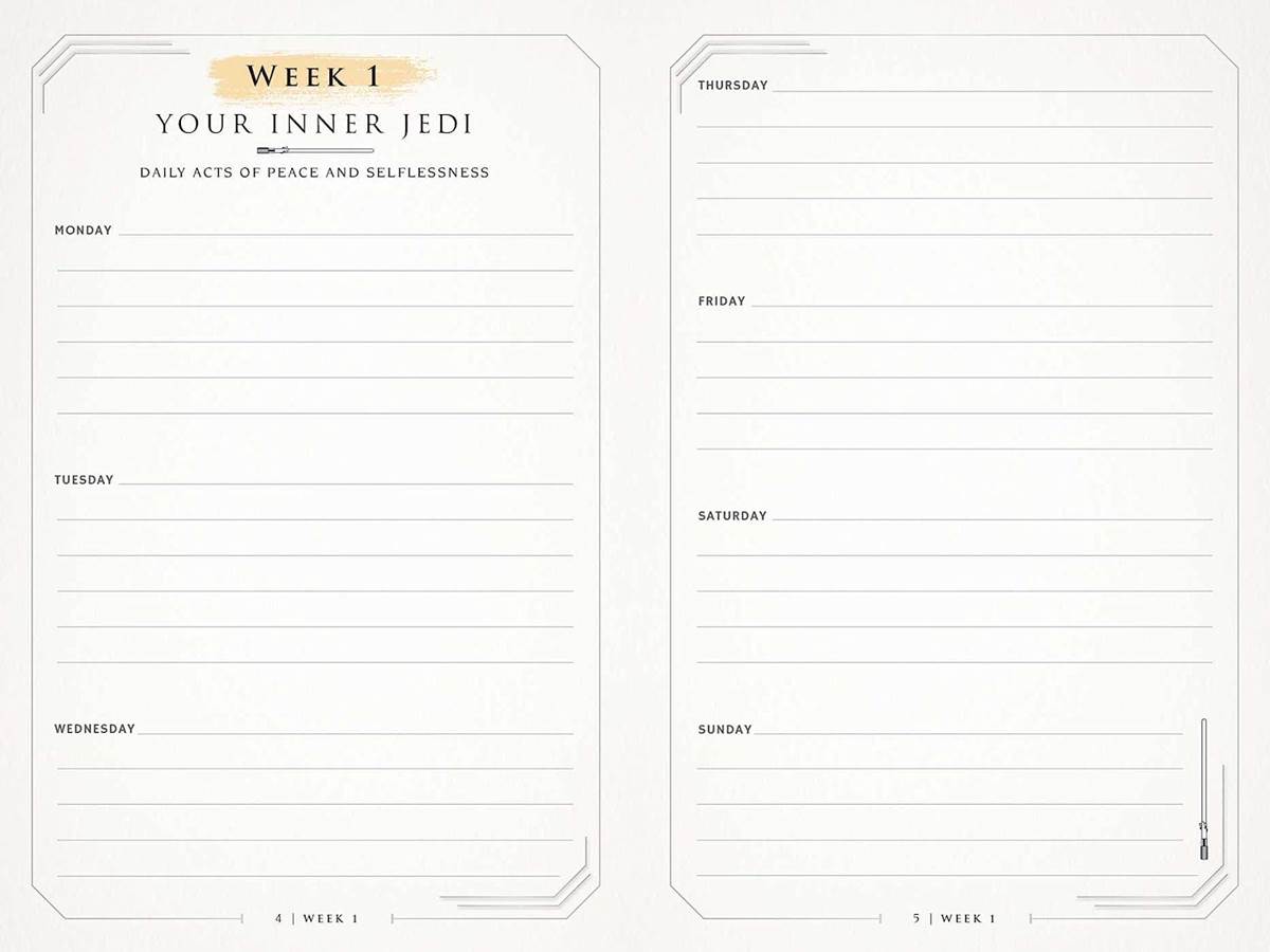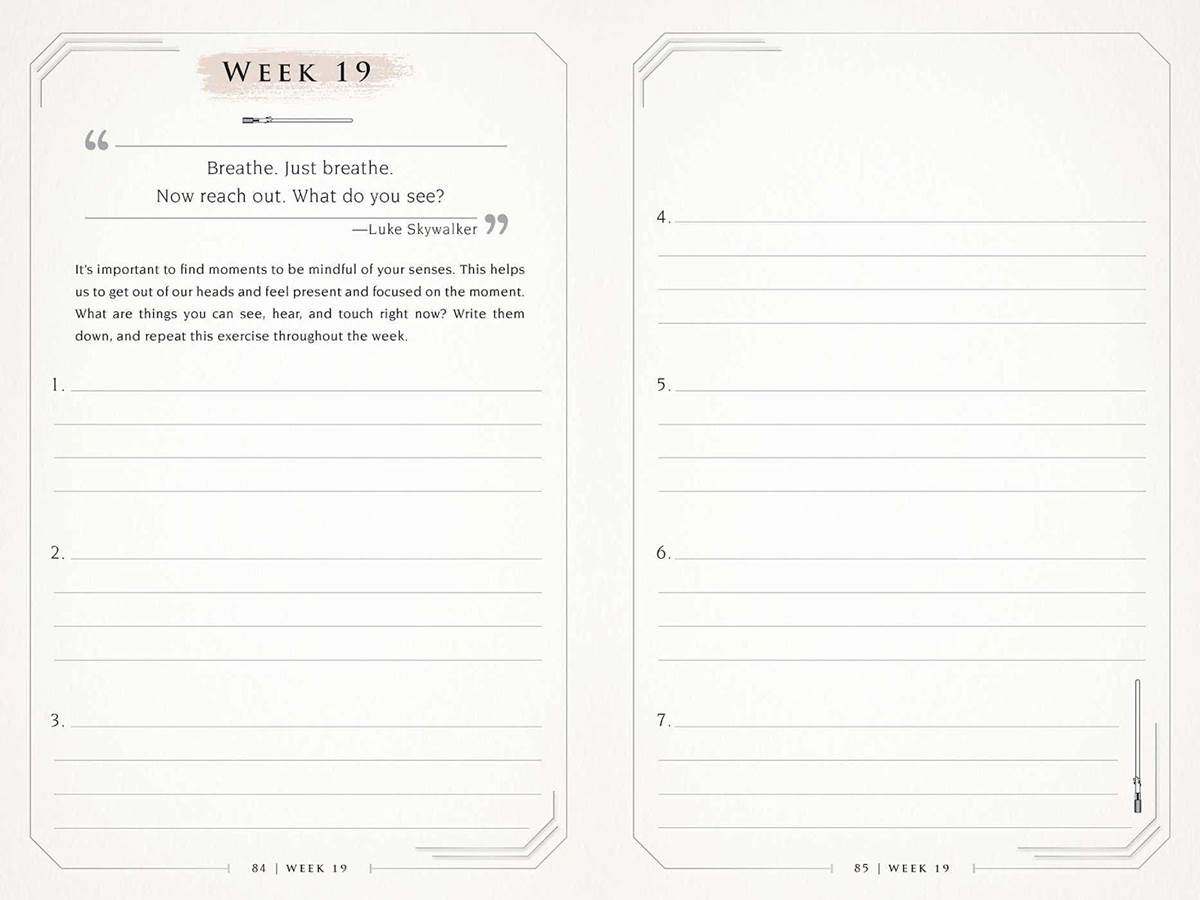 Star Wars: Inner Jedi consists of 52 weeks’ worth of examples and quotes from the Star Wars movies and television series, accompanied by daily acts and reflections such as listing mentors who have influenced you or those you have influenced through mentorship, meditation practices, coloring and drawing exercises, and enumerating one’s own goals for the year. Each week’s page heading cites a lesson from the Star Wars franchise and prompts participants to cite similar cases from their own lives.