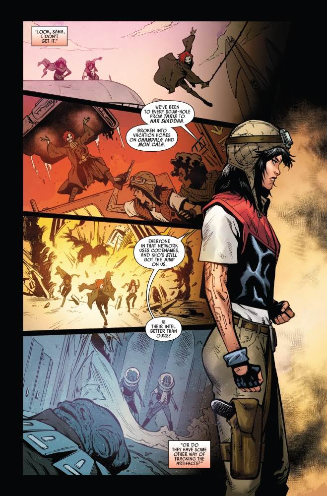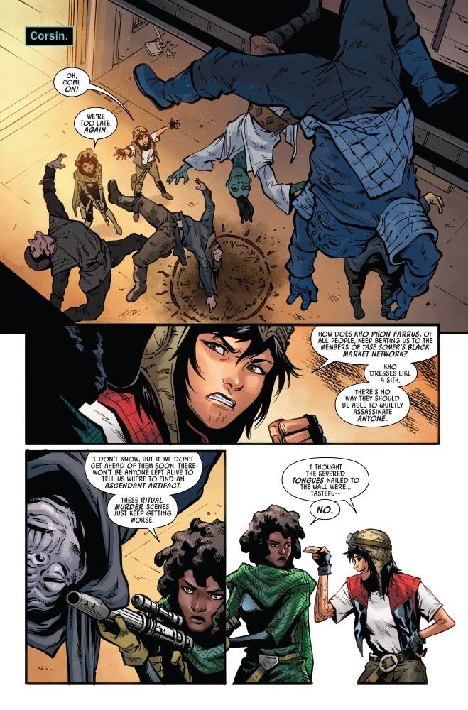 Naturally, Aphra and Starros are seeking out the same artifacts (I honestly forget why, but I think it’s an assignment from the evil industrialist Domina Tagge, who has the two rogue adventurers under her thumb) so they’re in pursuit of Farrus, who also happens to be committing a series of disturbing ritual murders along the way. But first, this issue checks in with skilled assassin Just Lucky, who’s hanging out in Canto Bight after returning from the ordeal on Jekara (see Star Wars: War of the Bounty Hunters for more) and considers what to do with the valuable Ring of Vaale he’s stolen from Domina’s nephew Ronen Tagge. Lucky’s had a falling out with his own ex-lover Ariole Yu, who has now disappeared, so he hesitantly returns to the Tagge compound. Then Chelli and Sana’s narrative jumps ahead in time a bit, and we see that they’ve been chasing Kho Phon Farrus from planet to planet to no avail. Desperate for a plan, they enlist disgraced scientist Beol De’Rruyet to help them lure the false Sith into a trap.