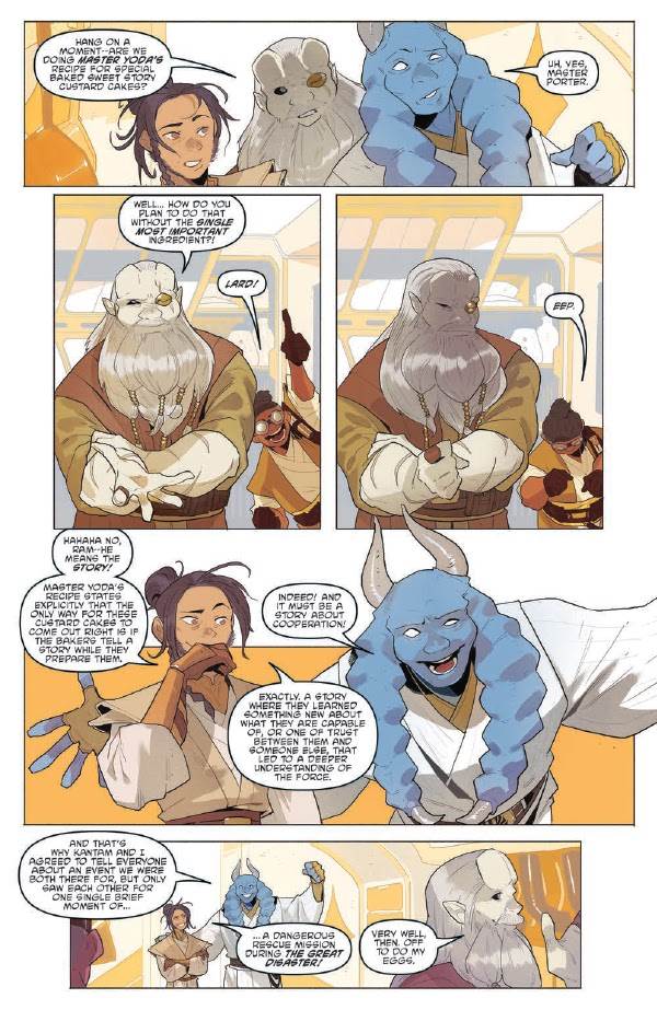 Written by Daniel José Older (Star Wars: The High Republic - Midnight Horizon) and Vita Ayala (Marvel’s Acts of Evil), The High Republic Adventures - Galactic Bake-Off Spectacular begins with the Jedi preparing baked goods as prizes for the above-mentioned race, but the recipe in question calls for a story to be told during the process. So Master Torban “Buckets of Blood” Buck relates a tale from a not-too-long time ago, when a starcruiser called the Voyager Dawn– a meditation retreat for eldery Jedi– was damaged by the “Emergences” as first seen in author Charles Soule’s series-launching Star Wars: The High Republic - Light of the Jedi. Buck and his fellow Jedi Master / best friend Kantam Sy take a freighter in to evacuate the ship’s hundreds of residents, but encounter some obstacles along the way to achieving that goal. Upon rescuing what is believed to be the Voyager Dawn’s final inhabitant, Sy receives an urgent plea for help and must rush back into the vessel to assist another aging Jedi (named either Griswel or Griswal– it’s spelled both ways in the comic) who is overcome by the incalculable fear and anguish the Great Disaster has generated in the Force.