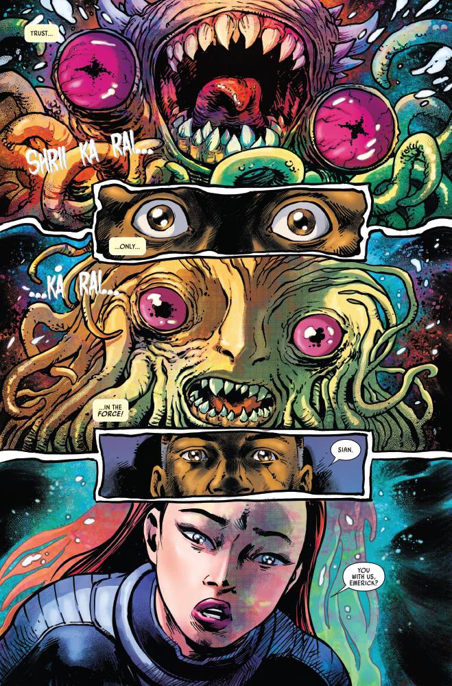 Over the previous four issues, Jedi Master Emerick Caphtor has teamed up with private investigator Sian Holt to look into this puzzling enigma, and their path has led right back to the enormous space station known as Starlight Beacon– the Jedi Order’s home base in the Outer Rim. Of course, they happen to arrive there just as the calamitous disaster depicted in Claudia Gray’s book Star Wars: The High Republic - The Fallen Star is taking place. With the help of two Chadra-Fan companions (one a helpful citizen on the side of good, the other a deliciously amoral scientist), they must board the doomed station to help evacuate survivors– and to hunt for one of the creatures, which are now plaguing Starlight Beacon.