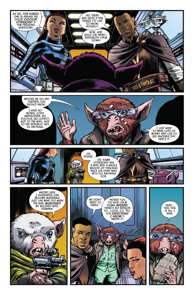 This is a fantastic climactic issue for Trail of Shadows, with Caphtor and Holt (still love that buddy-cop partnership name) crossing paths with Master Torban “Buckets of Blood” Buck and the Padawans he’s seeking to rescue. But that can’t happen until Caphtor gets the evidence he needs so the Jedi can study the beast’s anatomy and hopefully come up with a way to defend against it. There’s a terrific scene in which the two detectives must brave the effects of the Leveler (we do learn its real name in this issue, in a way, though I won’t reveal that information in this review) in order to get physically closer to it, and that’s where this comic’s art and writing really come together to deliver something special. And though this miniseries has come to an end, the aftermath of these events teases more to come for The High Republic and our protagonists’ inquiry into the nature of this threat. But for now I’m just incredibly satisfied to have consumed a top-notch film-noir murder-mystery story set in the Star Wars universe.