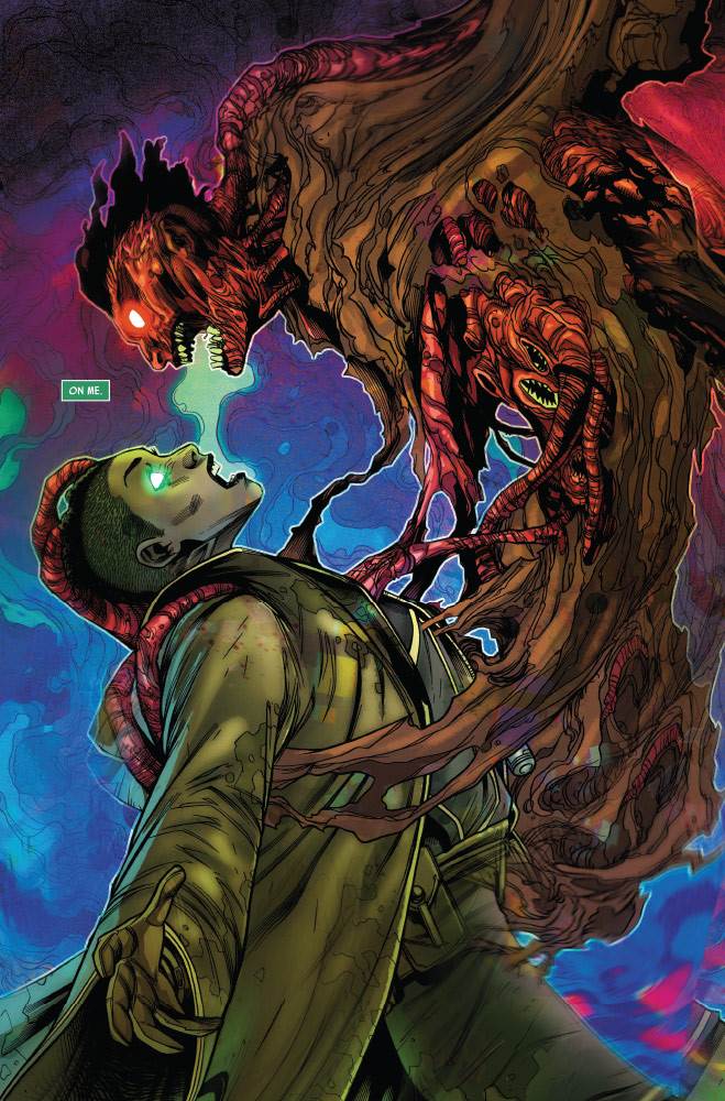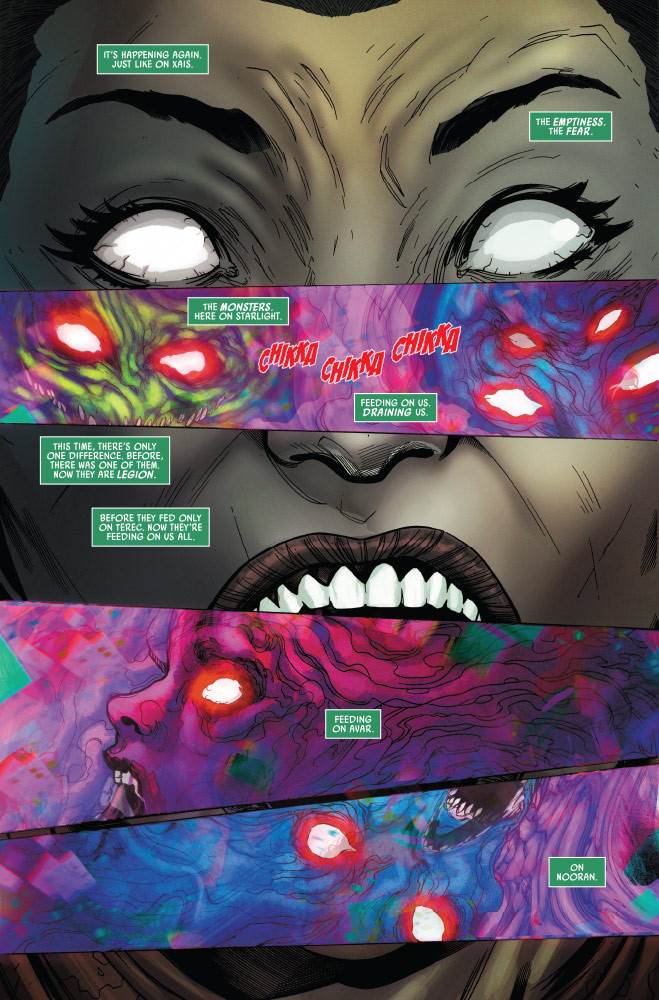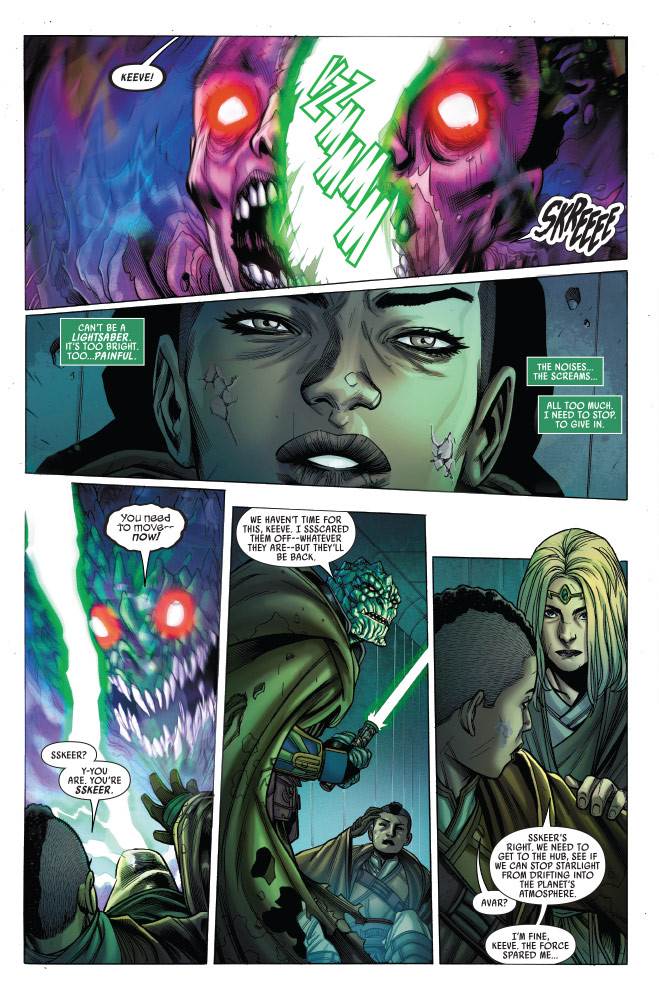 The High Republic #15 opens where the previous issue left off– with Keeve, Sskeer, and Avar helping survivors evacuate Starlight Beacon, which is swiftly drifting toward its gravity-induced doom above the planet Eiram. But the Jedi have once again come into contact with the mysterious Force-draining creatures who freeze them in their tracks via sheer terror and threaten to end their lives entirely, turning them into husks of dust– now set loose on the space station by the ruthless band of marauders known as the Nihil. Thankfully, Sskeer’s recent detachment from the Force (brought on by a disease unique to the lizard-like Trandoshan species) prevents him from being affected by the creatures’ powers, so he is able to temporarily fight them off as Keeve and Avar continue on their rescue mission. Meanwhile aboard the starcruiser Ataraxia, docked with Starlight, the Nihil prisoners are set free and Tempest Runner Lourna Dee begins to exact her revenge on her Jedi captors.