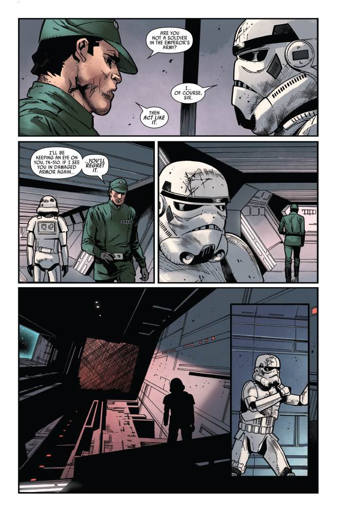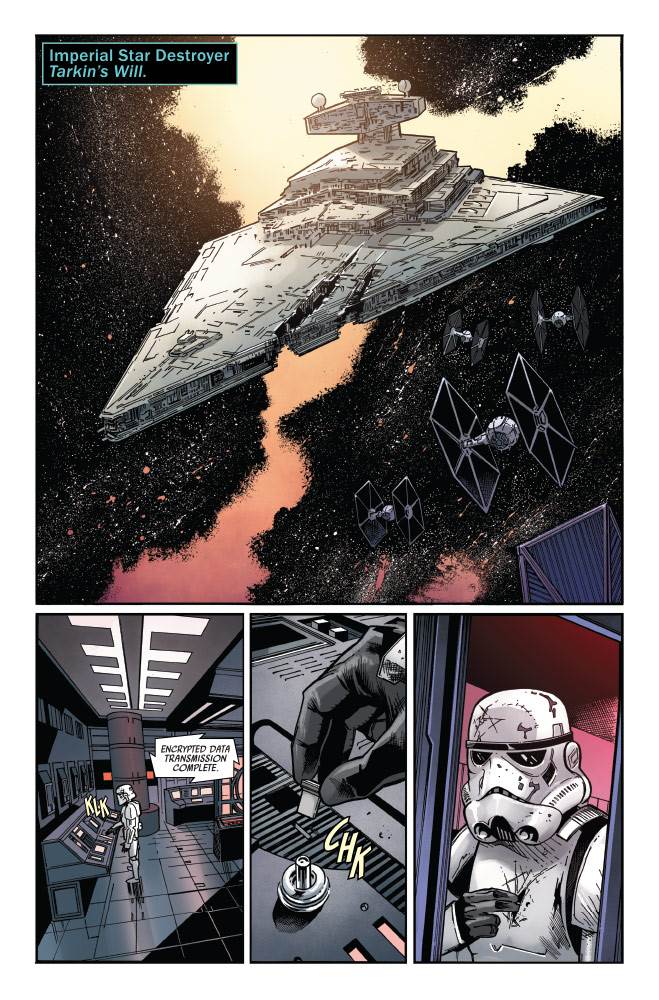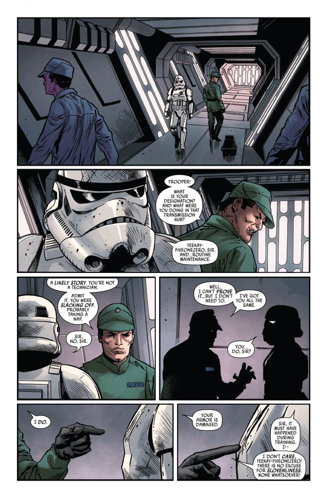 That is, if she doesn’t rescue herself first. Star Wars (2020) #21 opens with Shara Bey, having spent some time in hiding on the Star Destroyer, donning a disguise of stormtrooper armor salvaged from the corpses left in the sealed-off sections of the capital ship damaged in the destruction of the first Death Star. She sneaks through the ship’s hallways, sending secret transmissions to the Rebellion, and trying her best not to get discovered by the Imperial officers on board.
