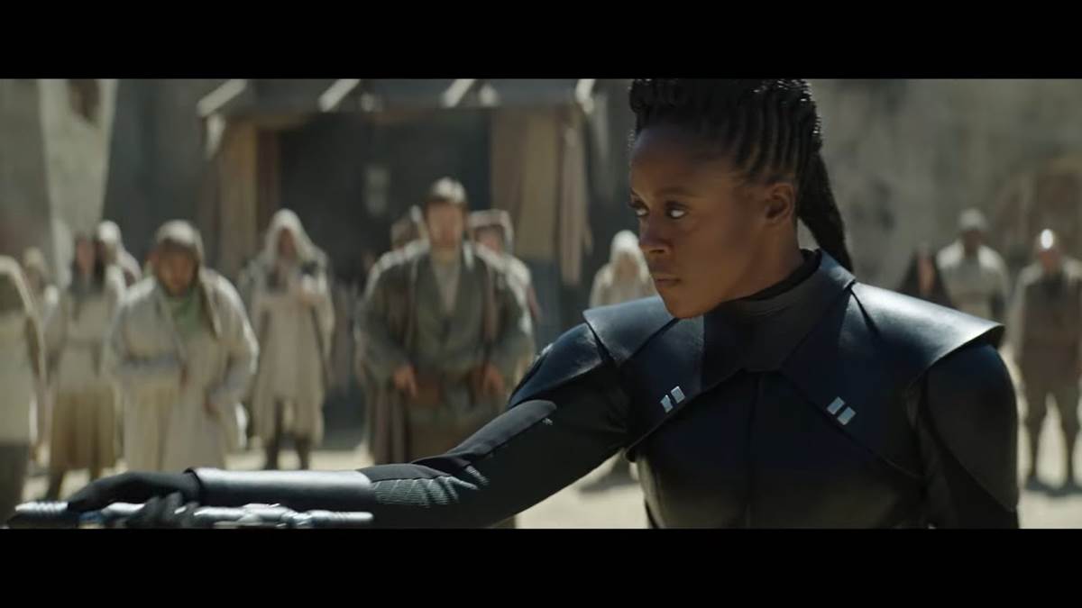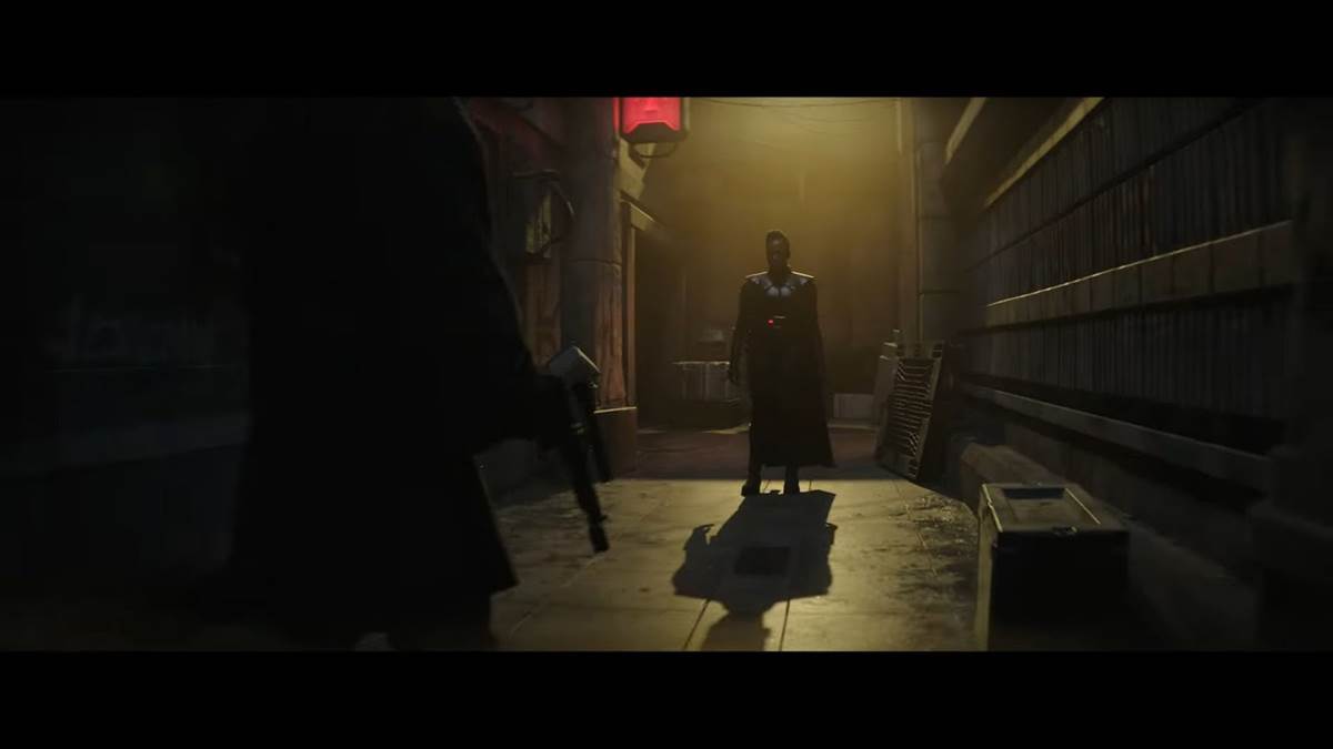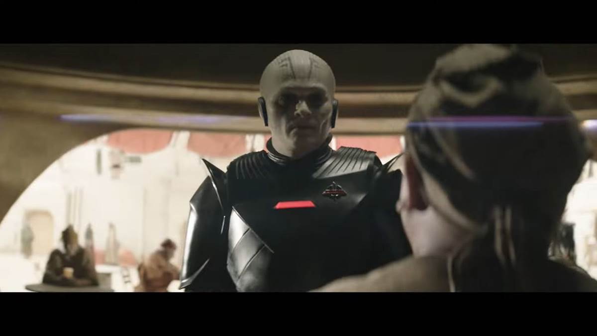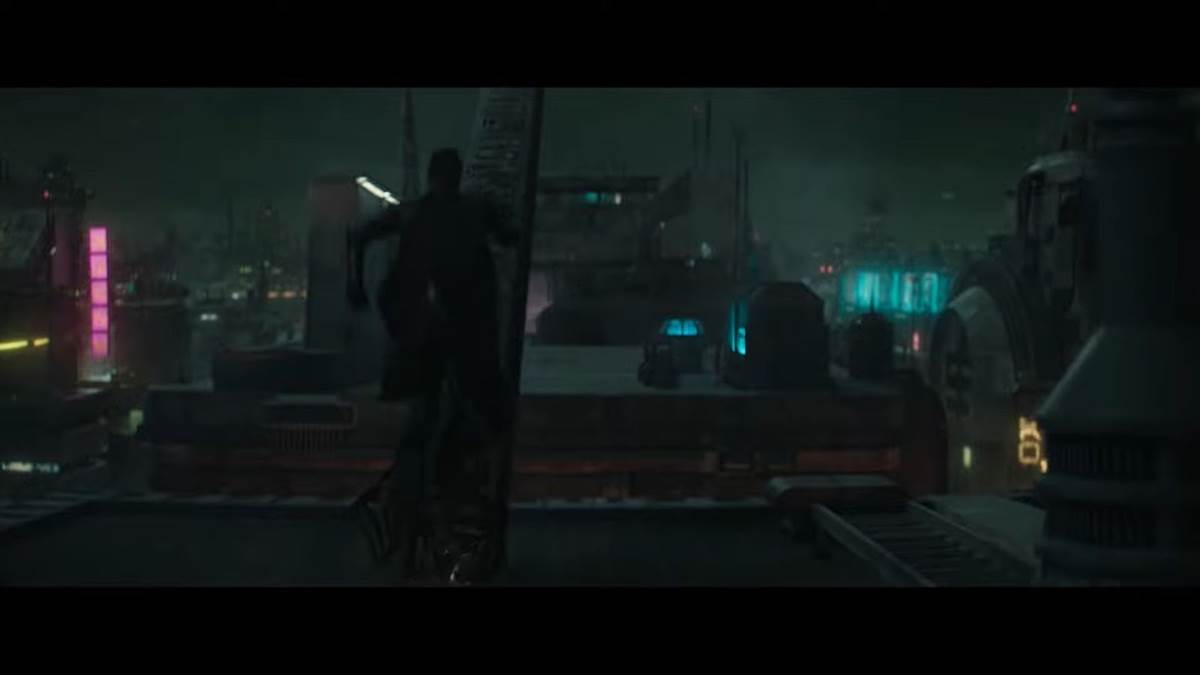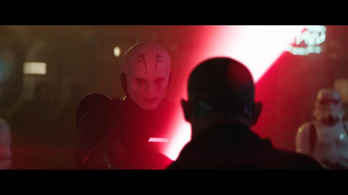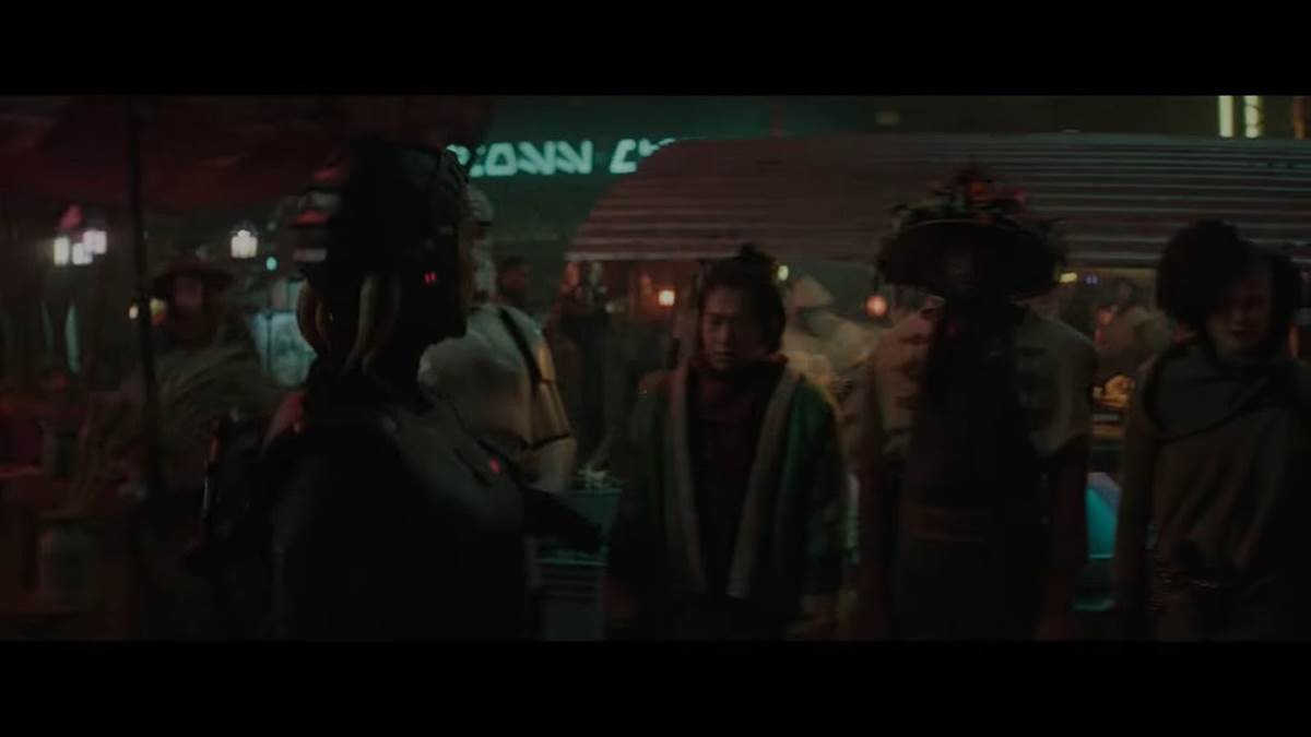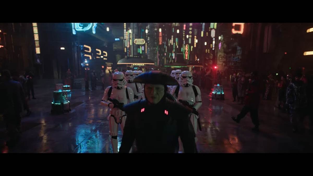 Shot 18: Reva crouches on a rooftop on the bustling planet of Daiyu (as revealed in today’s Entertainment Weekly article about Star Wars: Obi-Wan Kenobi). The Aurebesh in the neon lights here reads “ER.”