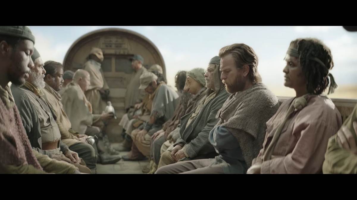 Shot 13: Obi-wan sits in the trailer pod with what looks like a group of migrant workers. A couple different alien species can be spotted among the group of mostly humans.