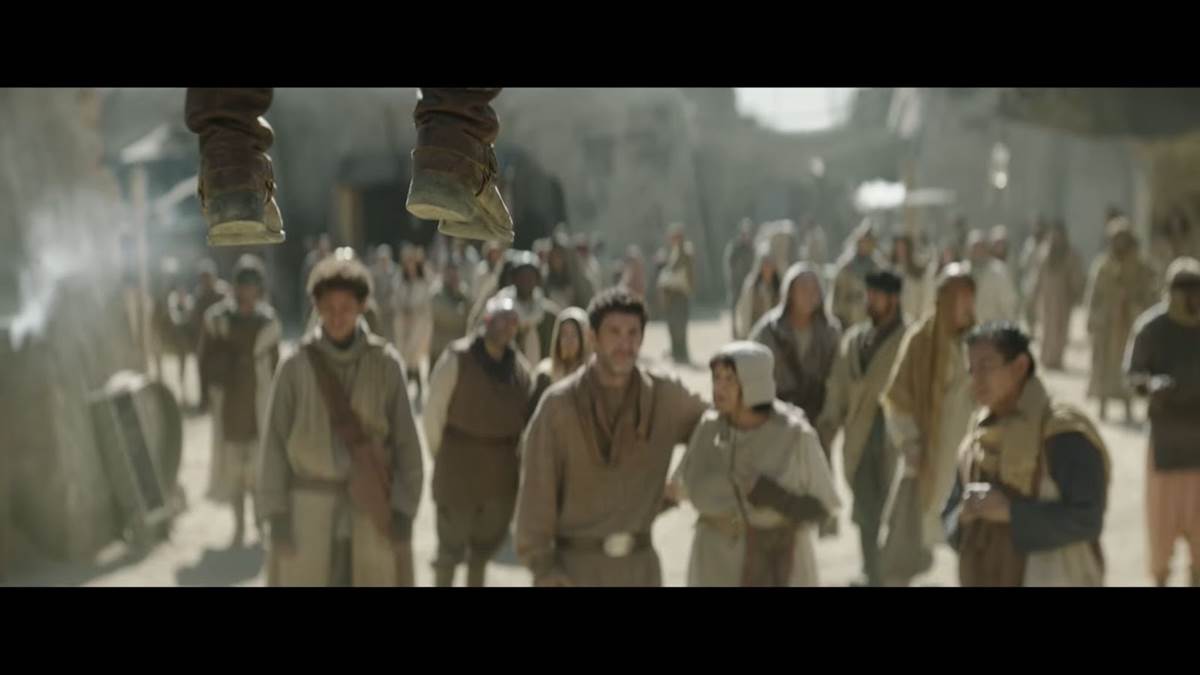 Shot 15: A crowd gathers and looks up at someone who has been hanged on Tatooine, presumably for not participating with the Inquisitors’ hunt.