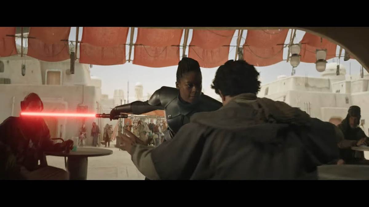 Shot 32: An unknown character (his haircut doesn’t quite match Owen’s) tries to slip past Reva in the Tatooine restaurant, but doesn’t quite make it, as she cuts him off and ignites her lightsaber.