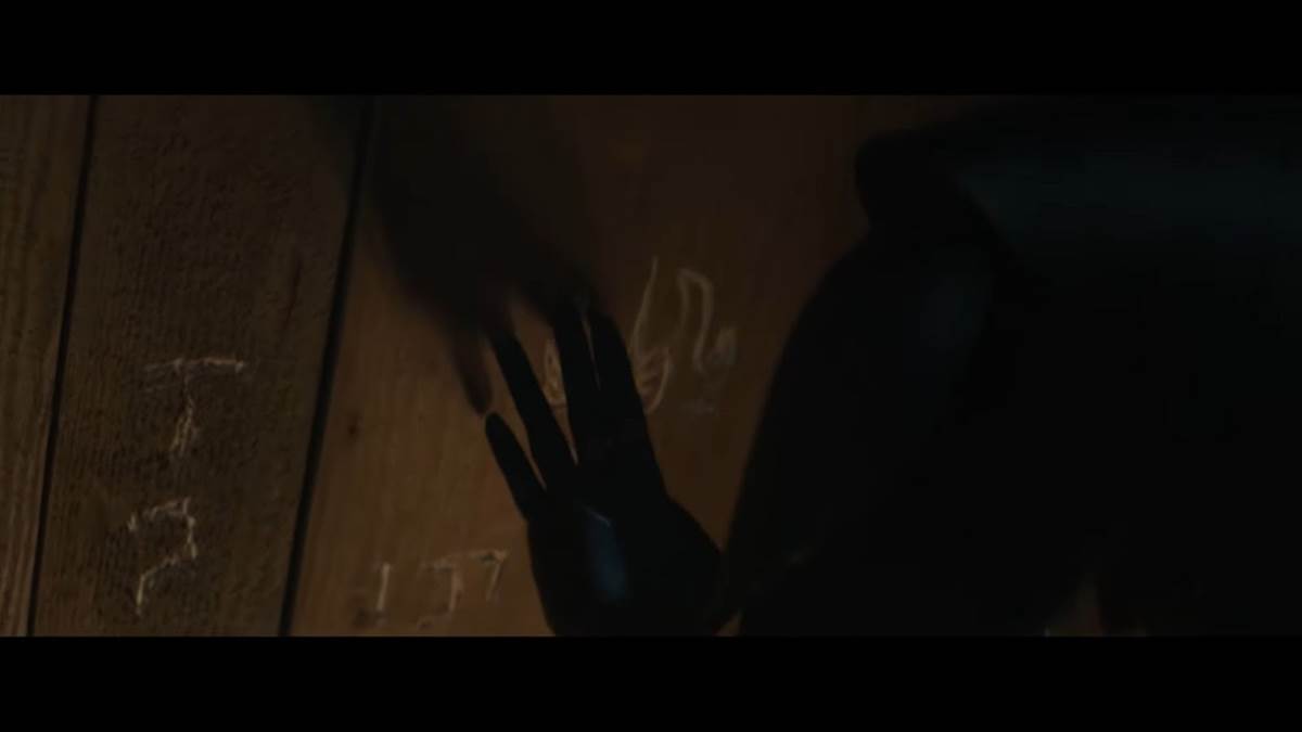 Shot 34: A hand, in silhouette, brushes up against some symbols etched into wood paneling. I can’t quite make out what they’re supposed to be, but the one behind the fingers looks like the Jedi Order insignia.