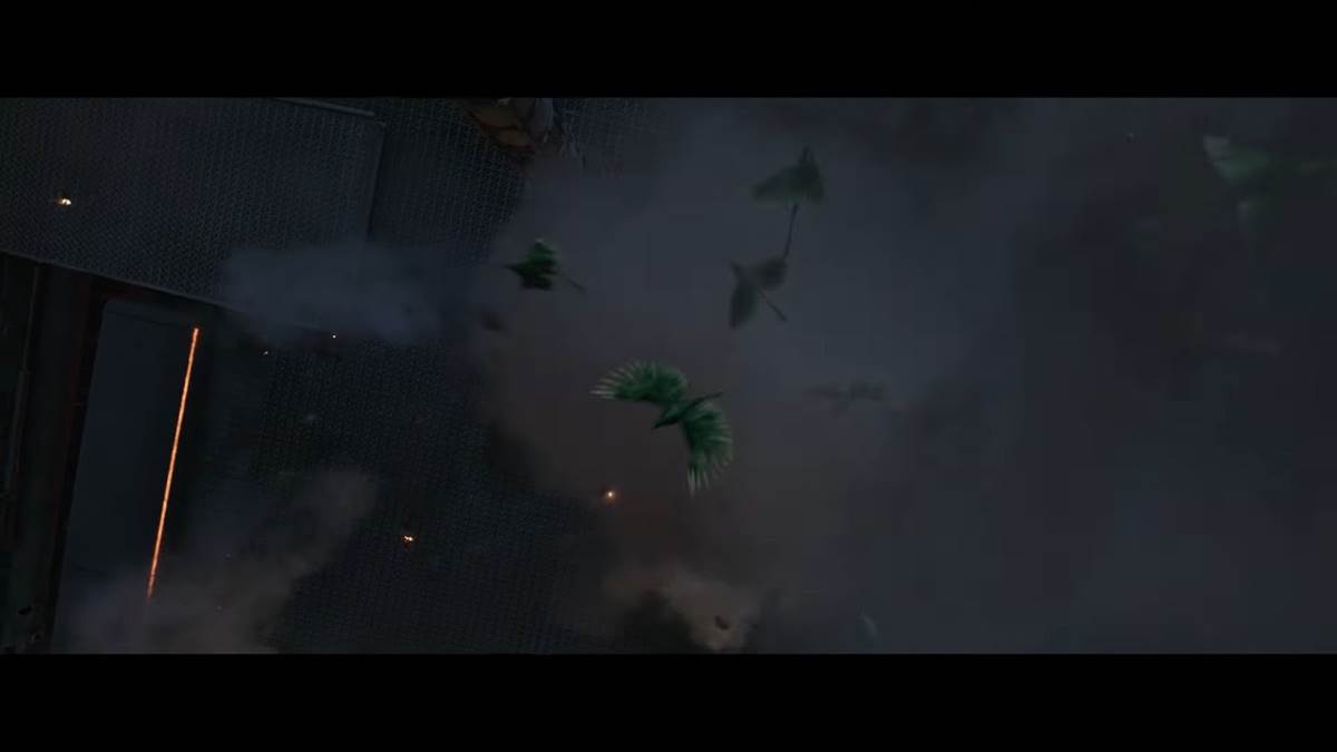 Shot 37: From above, a flock of green-feathered birds take flight from the roof as the blaster fight continues.