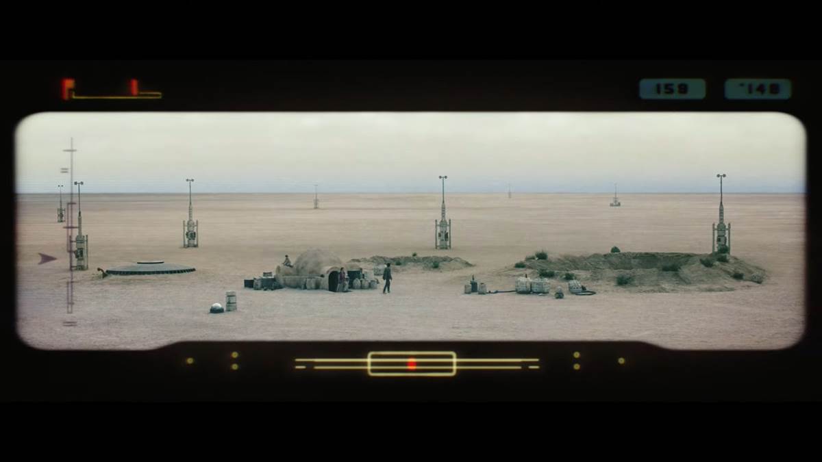Shot 6A: Obi-Wan’s point-of-view looking through macrobinoculars at the Lars homestead, surrounded by moisture vaporators. Beru Lars (Bonnie Piesse) stands in the entrance, while Owen Lars (Joel Edgerton) walks to the right. A roughly ten-year-old child sits on the homestead’s main structure.
