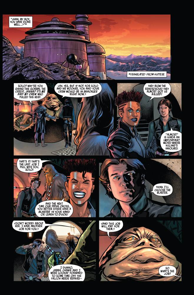 As Han Solo & Chewbacca begins, in fact, our antiheroes are in the midst of one of those jobs– preparing to pick up a crew escaping from the Casino Planet of Galator III with the Millennium Falcon. That crew isn’t too thrilled that Han and Chewie showed up late, however, and they take that grievance to Jabba, who luckily sides with the infamous Corellian and his trusty Wookiee pal, even going so far as to offer them their next illicit gig.