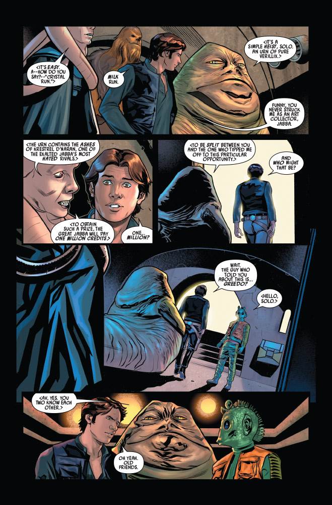 The first issue of Marvel’s new comic-book series Star Wars: Han Solo & Chewbacca opens with a one-panel flash-forward to Han frozen in carbonite– a quick reminder that while the bulk of the current ongoing Star Wars comic titles are set between the events of The Empire Strikes Back and Return of the Jedi, this series is rewinding time a bit to the period before Episode IV - A New Hope, when the title characters were smugglers and thieves working for crimelord Jabba the Hutt.