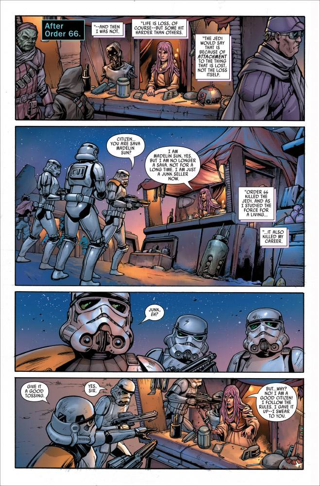 Well, she was known only as the Archivist until this issue, which gives her previous name as Madelin Sun (almost certainly a nod to real-world Lucasfilm archivist Madlyn Moskowitz)-- a scholar who studied the dark side of the Force prior to Order 66. Once the Jedi Order was eliminated and their beliefs outlawed by Emperor Palpatine, Sun gave up her academic pursuits and worked as a junk dealer until one day when the Empire came calling. Rescued by Qi’ra, Sun was then enlisted to track down Jedi Master Yoda in his exile– a task she performs successfully, though the question remains whether she wishes to divulge her findings to Crimson Dawn. Along the way she interrogates Jeremoch Colton (the character played by original Boba Fett actor Jeremy Bulloch in Star Wars: Episode III - Revenge of the Sith) and finds that she has a distaste for using the Ascendant’s dark-side artifacts Qi’ra has in her collection.