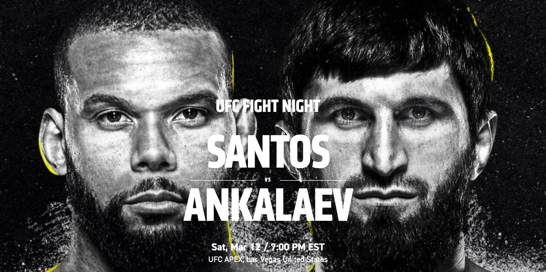 UFC Fight Night: Santos vs. Ankalaev will be held Saturday, March 12 at 7 PM ET. Fight fans can watch live on ESPN+.