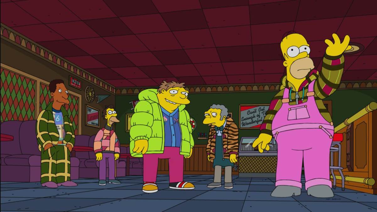 “Finally I know how it feels to be stylish,” says Homer, realizing why people own more than one outfit. At the skatepark, Orion says he’s never hung out with a regular kid before. “I guess I envy you.” He offers to design a new sneaker with Bart and promises to make too few for all of his friends to be able to get them, an idea which of course Bart loves. At Moe’s the barflies are astonished by Homer’s new sense of style, so he brings in the crate of Slipreme outfits and gives the clothes to Lenny, Carl, Barney, and More. The makeover is so successful that Homer delivers more of the clothes to his other middle-ages friends around town. Meanwhile, Bart and Orion work on their sneaker design together– “The Bartman One.” They plan a party to reveal the sneaker, but then Principal Skinner enters Orion’s store and wants to buy a hoodie, making the celebrity come to the realization that his clothes have become uncool.