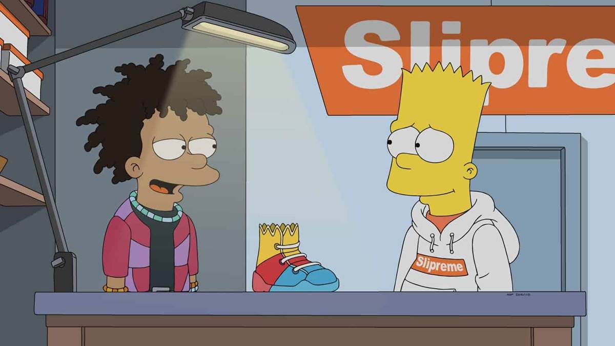 “Bart the Cool Kid” begins with Bart arriving at Springfield Elementary School to see all the kids astonished by Ralph Wiggum’s new sneakers. “Those aren’t just sneakers. They’re Slipremes,” explains Milhouse, who further expounds that the shoes are endorsed by a popular TikTok star named Orion Hughes (guest star The Weeknd). At the Simpson home, Bart begs his parents to buy him a pair of Slipremes. “I’ve never wanted an article of clothing so bad in my entire life.” Homer agrees to get the shoes, so he takes Lisa to Springfield’s hip new shopping district, but they get stuck in line behind hundreds of hipsters to get into a store owned by Orion. The next morning, Homer wakes up Bart and gives him the shoes, having camped out overnight to get them. “Bought love is the best kind of love,” Homer says when Bart hugs him and says, “I love you.”