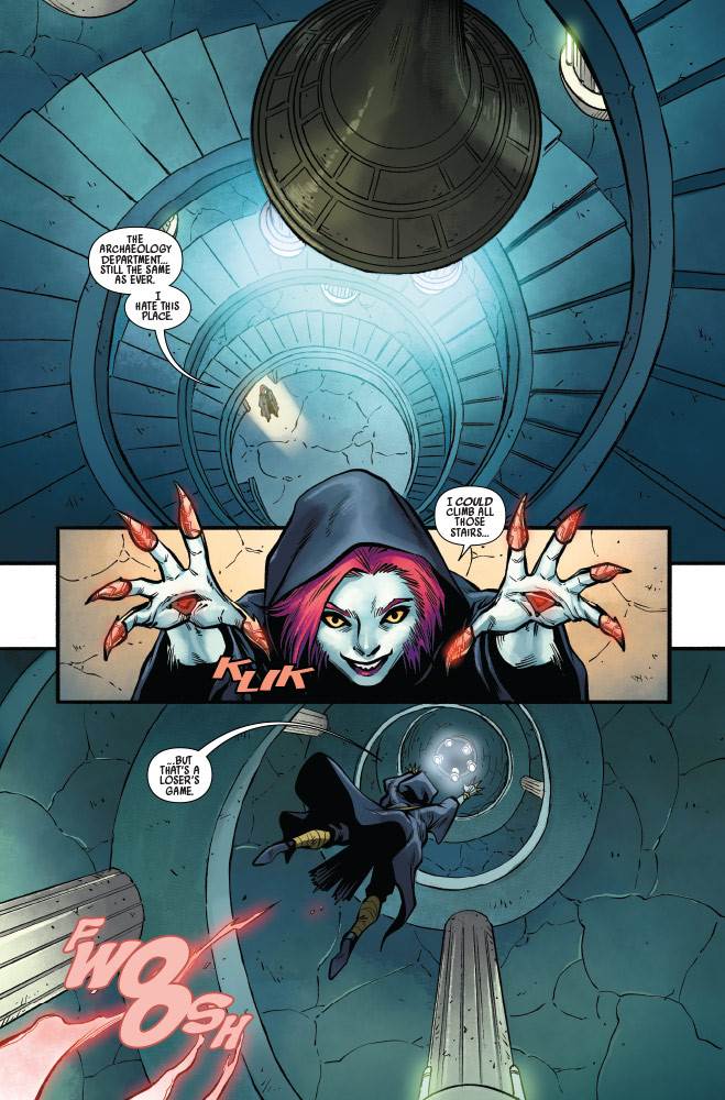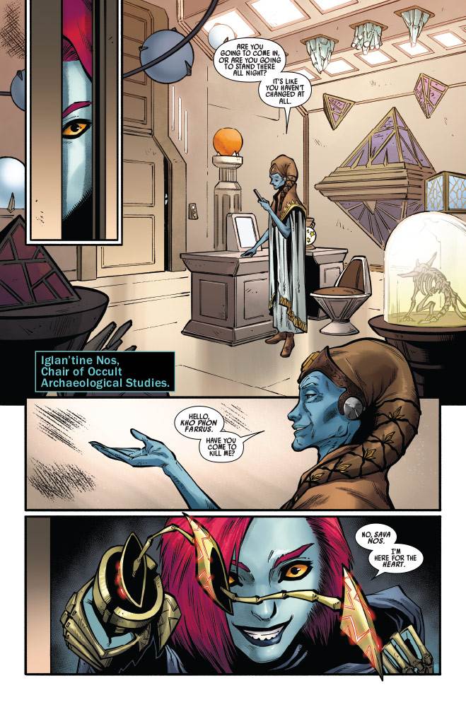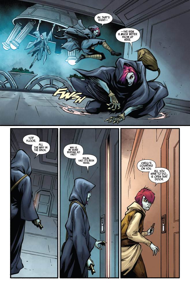 In the present (this comic, like several of Marvel’s other ongoing Star Wars titles, is currently set between the events of The Empire Strikes Back and Return of the Jedi), we see Farrus return to that same professor’s office, this time with the intent of collecting an ancient Ascendant artifact known as the Spark Eternal. Meanwhile, Chelli and Sana race through hyperspace toward Bar’leth in Starros’s ship the Volt Cobra, hoping to reach the university before Kho claims more power than they’re capable of handling responsibly as a wannabe Sith. Ignoring a summons from cutthroat aristocrat Domina Tagge, Aphra sets her sights on defeating Farrus and claiming the Spark Eternal for herself. Tagge hires the bounty hunter Boushh to pursue the archaeologist (following up on a dangling plot thread from last year’s War of the Bounty Hunters comic crossover event), and Kho confronts the Twi’lek Sava Iglan’tine Nos, demanding to know the location of the “Unyielding Heart”-- the final piece of the mystical puzzle they’ve been assembling in their quest.
