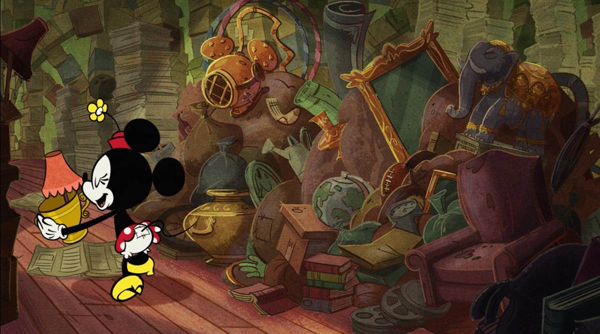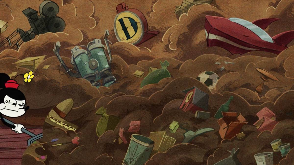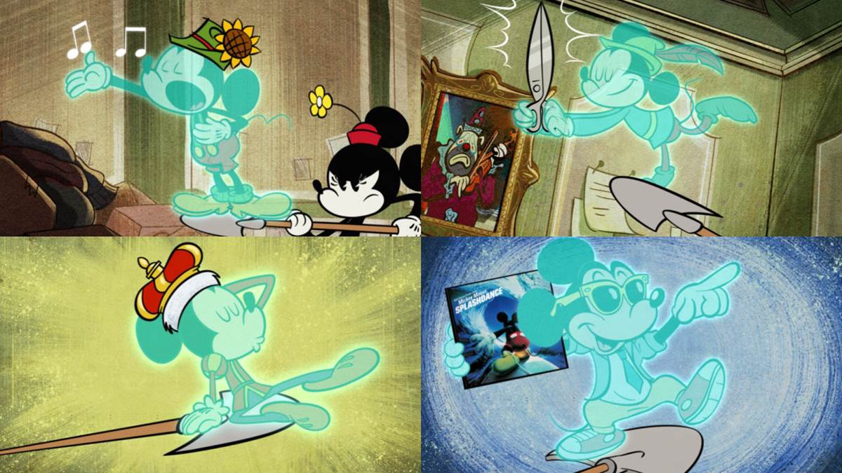 Minnie grabs a shovel and starts scooping items into the chute. Mickey recalls memories for each one, which take the form of a spirit. His hat from “Yodelburg,” scissors from The Brave Little Tailor, crown from The Prince and the Pauper, and the album Mickey Mouse Splashdance. As these items get tossed away, Mickey dumpster dives down the chute to save them.