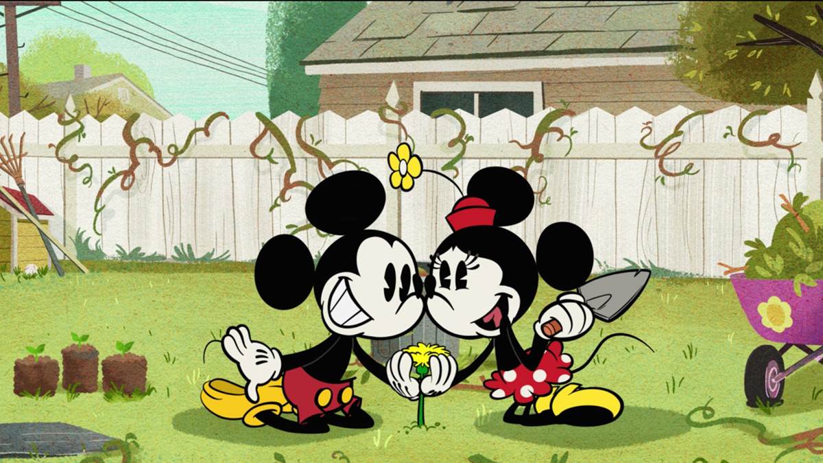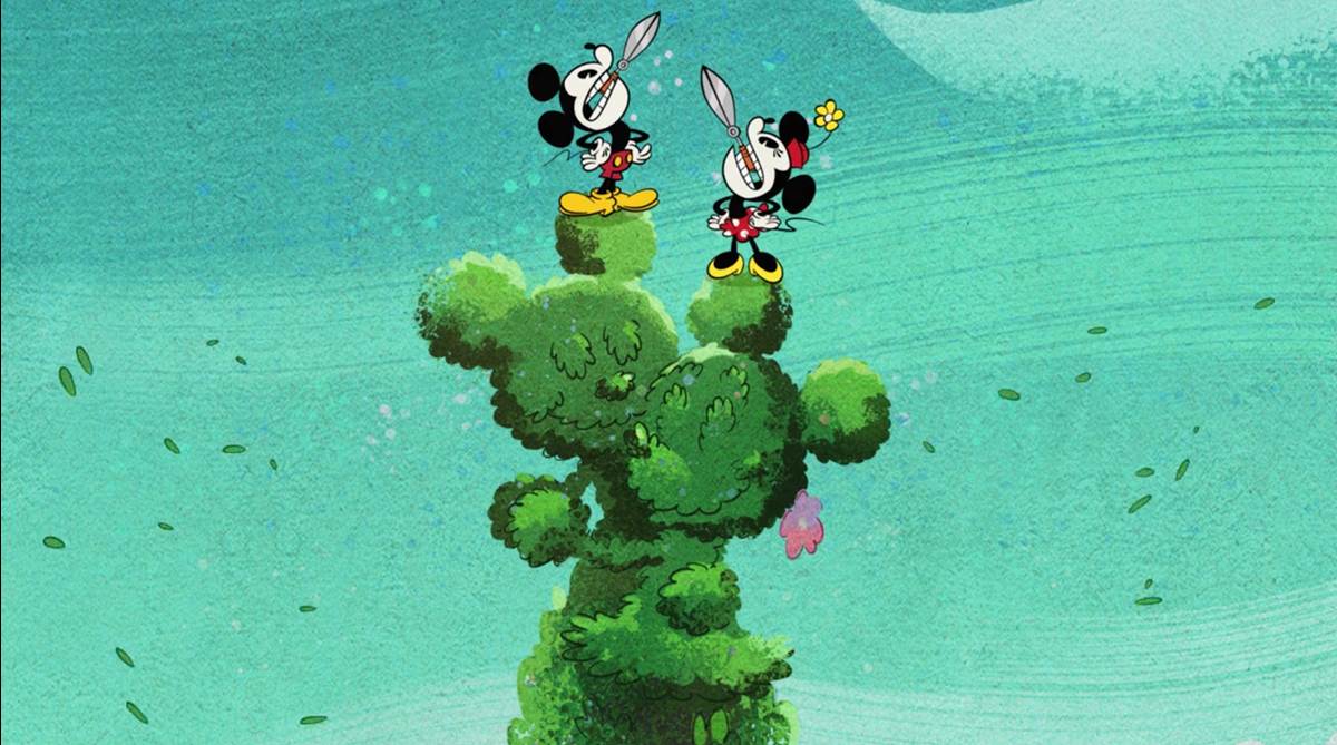 Mickey and Minnie are oblivious to the chaos ensuing around Mickey’s yard as they carve topiaries in their likeness.