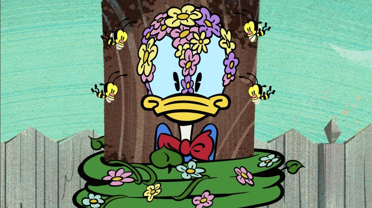This kicks off a love-infused planting spree, with flowers rapidly popping up all over Mickey’s yard. Soon, a cloud of pollen wafts into Goofy’s yard and we find out he’s allergic to it as he begins to sneeze. A vine plant from Mickey’s yard also goes berserk, climbing over Donald’s fence and tying the unlucky duck to his tree. He gets hit in the face with a bunch of flowers Mickey and Minnie are throwing and finds himself trapped, swarmed by bees (all of whom look like Spike).