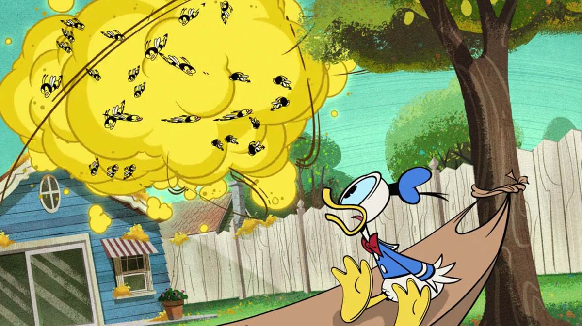 Goofy’s problems get worse as seeds fall into his yard, sprouting flowers that release bursts of pollen. Desperate for help, Goofy looks over his fence into Donald’s yard, the duck covered in bee stings, and asks for help. Donald puts a clothespin on Goofy’s nose just before the bees return for another round of attacks. Daisy steps outside with a tray of pink lemonade, but turns right back around when she sees the trouble Donald is in.