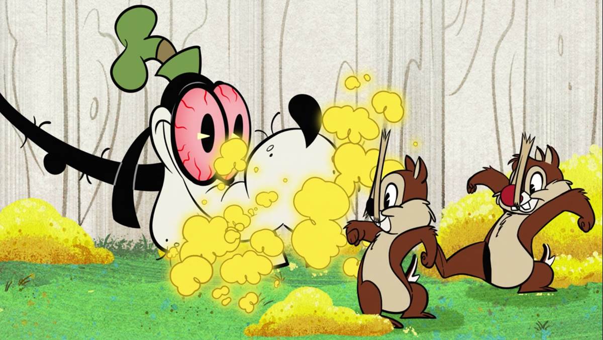 In Goofy’s yard, Chip n’ Dale suffer the same allergies he does and he decides to help them out, breaking his clothespin in two and putting it on their noses. In their hurry to leave, they kick up a fresh cloud of pollen and Goofy has an epic sneeze that spreads pollen all over the neighborhood.