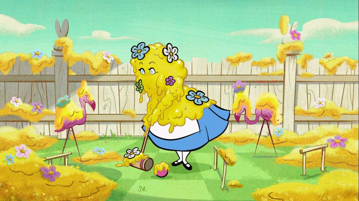 We see pollen landing in the yards of Horace and Clarabelle, Pete, and Alice, who was playing croquet.