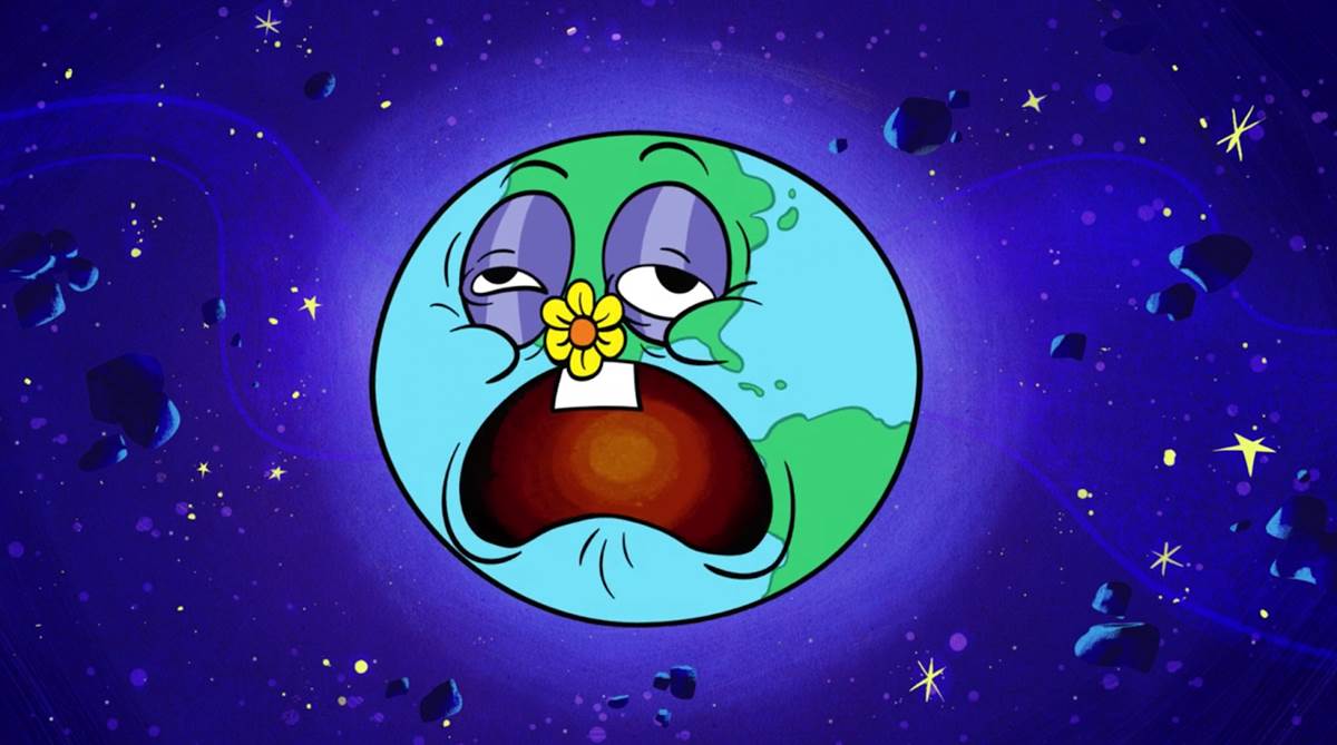 A giant sunflower grows and planet Earth comes alive, sneezing it off and all of the pollen along with it.