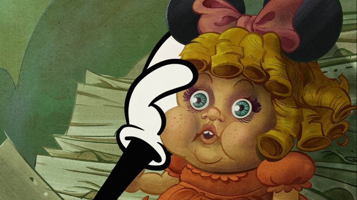 Just inside the door, we get a peek at Mickey’s hoarding habits, the nearest item being a doll that bears a creepy resemblance to Shirley Temple, wearing a pair of mouse ears. This may be a nod to The Twilight Zone: Tower of Terror, which features a classic Shirley Temple doll in its queue, the little girl in the story modeled after the tiny tot, carrying a Mickey Mouse doll.