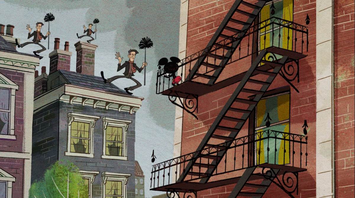 After riding the teacups with his churro, Mickey brought it home and encased it in glass to remember it forever. Minnie is adamant that Mickey get rid of it and she even gets him to dump it down the chute, but he quickly sneaks out a window onto the fire escape. He is greeted by chimney sweeps from Mary Poppins who sing “Chim-chim-cher-oo!” Mickey corrects them, repeating back “Chiim-chim-CHURRO!”