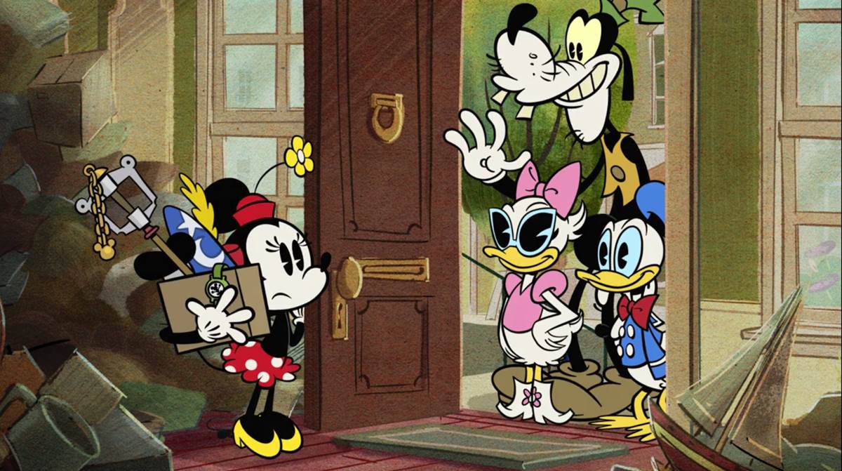 Goofy, Donald, and Daisy show up to help, Minnie answering the door holding two of Mickey’s most iconic hats (from Steamboat Willie and Fantasia) and a keyblade from Kingdom Hearts.