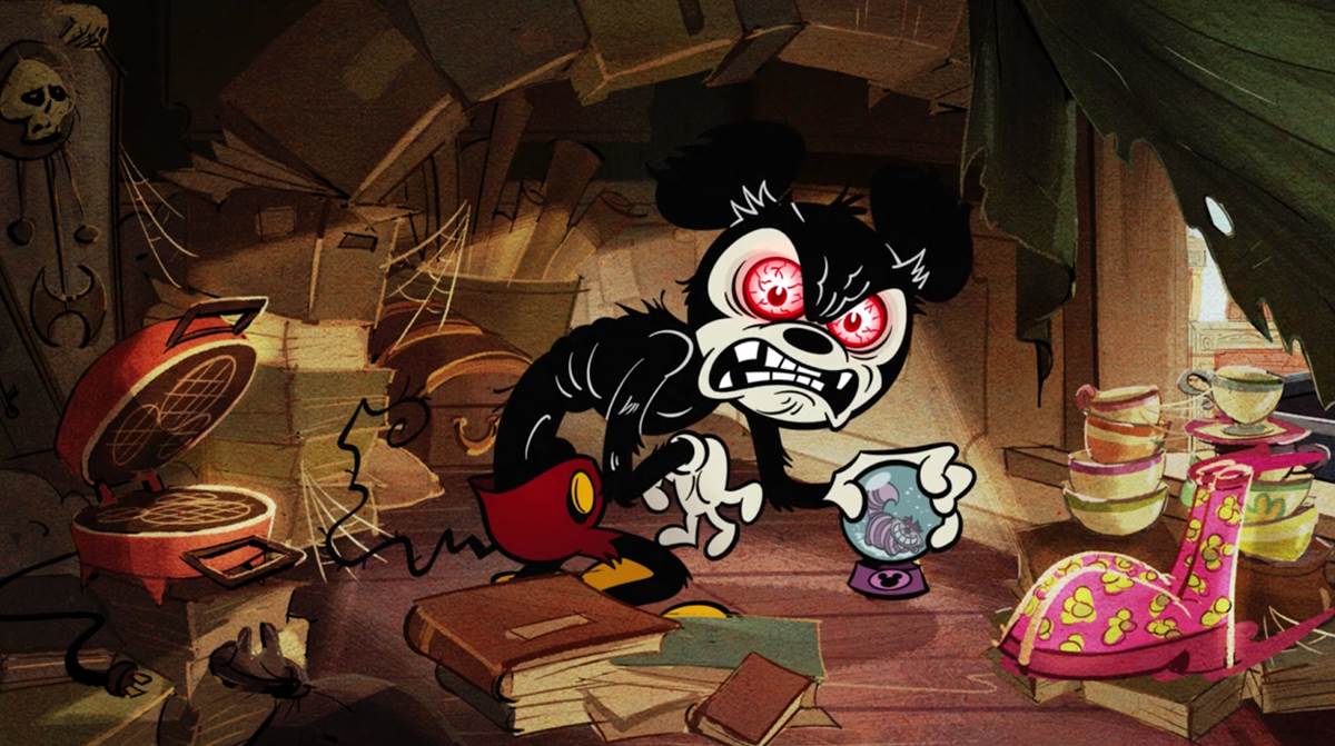 When they get upstairs, Mickey has turned into a Gollum-like creature, holding onto a Cheshire Cat snowglobe, a Mickey Waffle maker nearby.