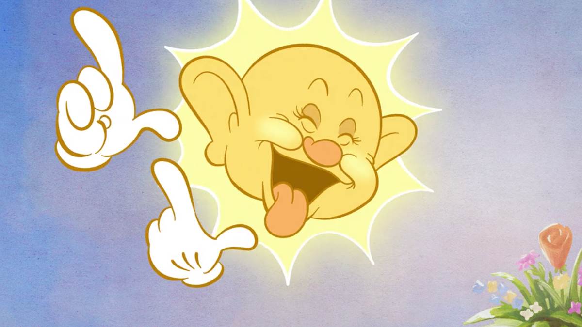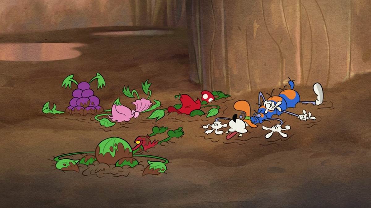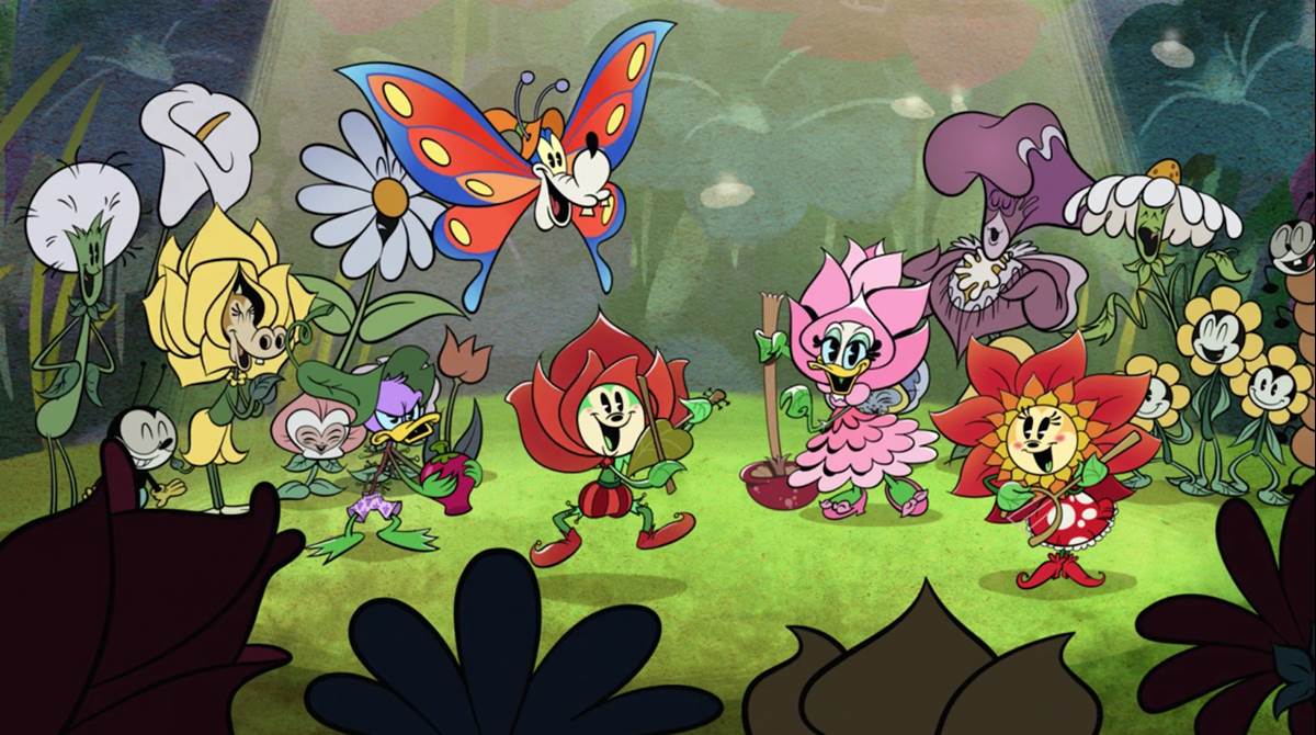 Mickey and his friends are all flowers (well, Goofy is a caterpillar and Donald is a bushel of grapes, to be specific) and they all sprouted near the mill, which doesn’t get as much sunshine as the top of the hill. Mickey can’t stand to see his pals so down, especially when he sees Clarabelle Cow, Horace Horsecollar, and Pete having so much fun in a conga line, joined by some other Silly Symphonies friends.