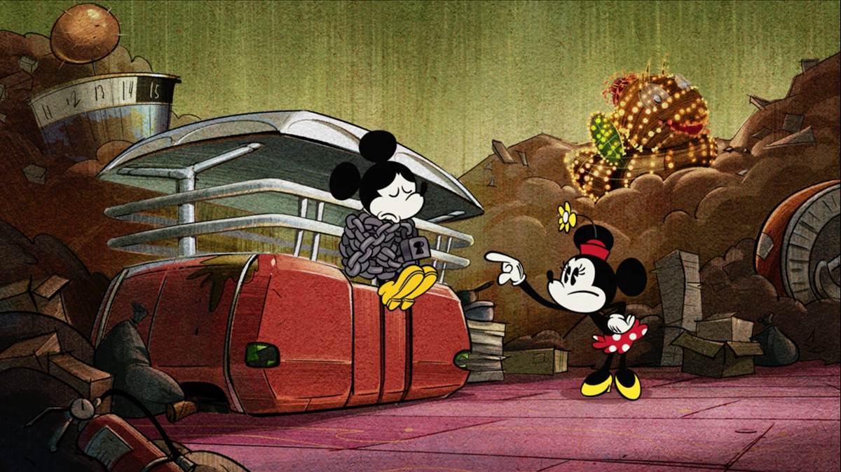 Mickey shoves them all in the room with the churro and Minnie catches him. She chains him up to one of his treasures, a red Disneyland Peoplemover vehicle. In the background, we also see the bumblebee float from the Main Street Electrical Parade and the old Clock of the World from Tomorrowland.