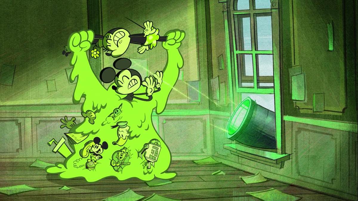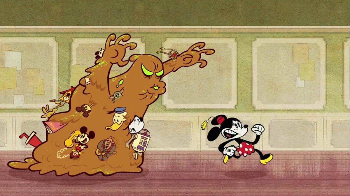 “Nooo!” Mickey screams as he breaks free from his chains and bursts through the wall, redirecting the chute from the ven through another window, flooding the room with the churro and other treasures. The room gets so full that the glass case around the churro breaks. It leaks a green glowing acid onto all of the items. Minnie comes to the door to ask if Mickey is okay, but when she opens it, she is greeted by a sentient trash monster and Mickey is trapped inside!