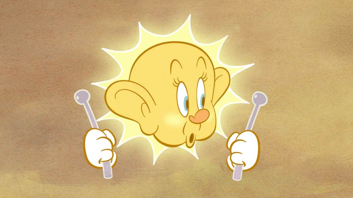 The sun, by the way, is played by Dopey from Snow White and the Seven Dwarfs. As Mickey and his pals reach the top of the hill, he hears the music and begins to dance along to it. He gets inspired to join in, pulling together some clouds and turning them into a drum set. But as he plays the drums, it starts to rain, followed by lightning and thunder, which sends Mickey and the gang sliding down the hill, back to the Old Mill.