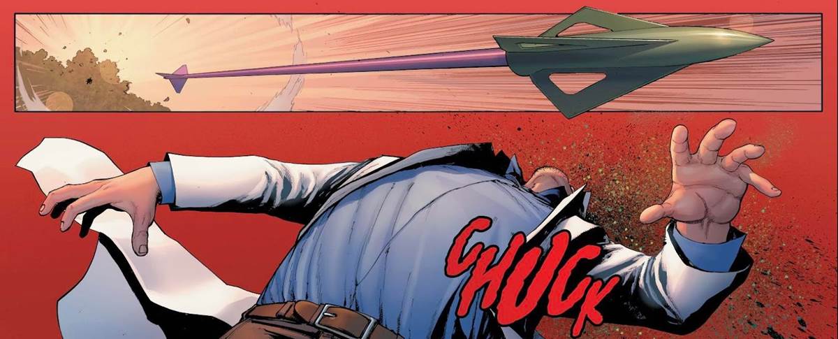 Yeah, I am once again cheating just a little bit here. I had to include the first of these two panels so you can see that it is a very recognizable arrow that is hitting Bruce Banner in the chest, killing him instantly. It’s a huge moment in the popular “Civil War II” series from 2016.