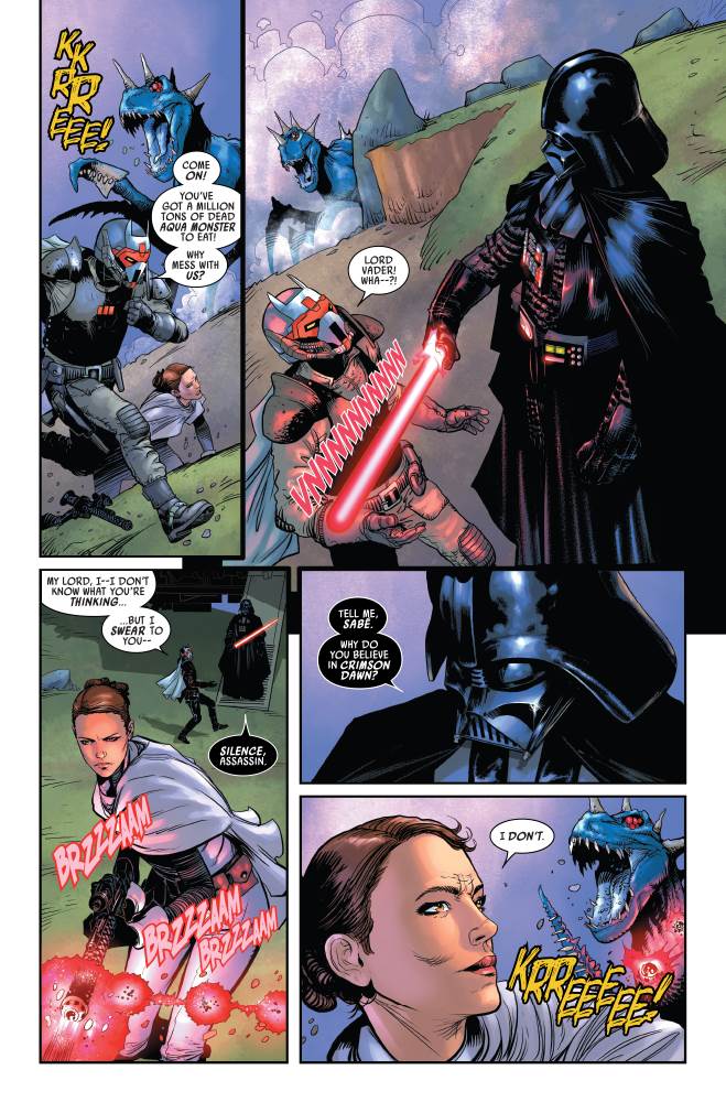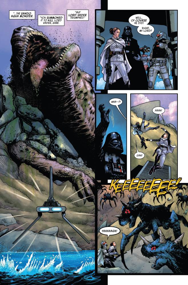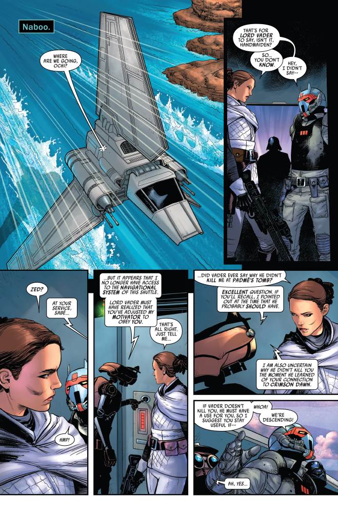 In last month’s issue of Star Wars: Darth Vader from Marvel Comics, the titular Dark Lord of the Sith revealed that he’s been aware of assassin Ochi of Bestoon’s betrayal and allegiance to Crimson Dawn. Now Vader has Ochi and Padmé Amidala’s former handmaiden / body double Sabé under his thumb and has brought them both back to the planet Naboo, and more specifically to the spot where in a previous issue the Dark Lord took down the enormous Sando Aqua Monster.