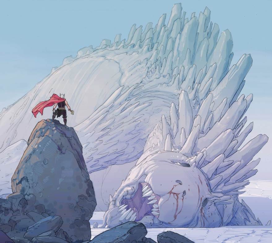 Again, the villain in this film is set to be Gorr the God Butcher. He was not given that name by mistake, he earned it. So if you put two and two together, it probably doesn’t mean great things for Zeus. We’ve already seen one apparent god skeleton in this teaser and the next shot shows the corpse of another. The great thing about this shot is that it is taken right out of the comics. In “Thor: God of Thunder #3,” Thor find the corpse of Falligar the Behemoth after he is slain by Gorr. Here, Thor and Korg seem to stumble upon the body of the fallen god. Thor certainly appears troubled by this sight.