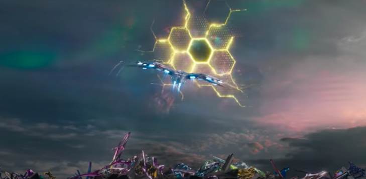 We then see what looks like the Milano lift off from a junk-covered planet and jump out of sight. The next shot reveals that it left a smiling Thor and Korg behind on this planet. Could they be returning to Sakaar, the planet on which they first met as gladiators in the Grandmaster’s games? And if so, what for?