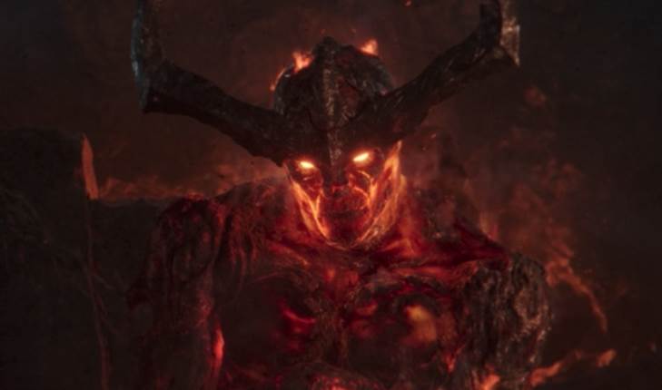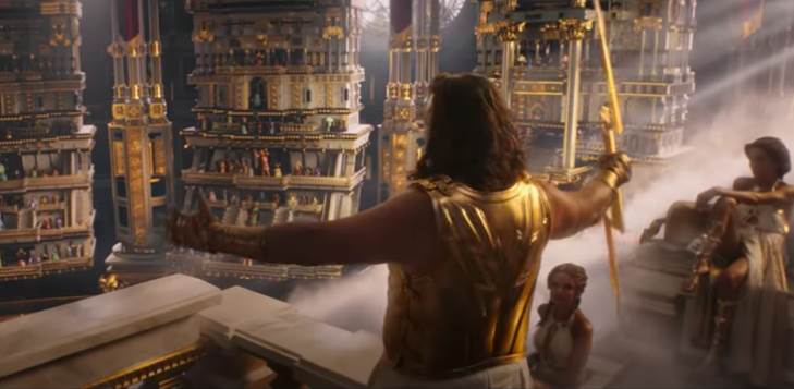 This hand (and lightning bolt) appear to belong to the MCU’s version of Zeus, who we know will be played by Russell Crowe. While we never get a look at his face in the teaser, we do see him from behind as he plays up to his audience in this massive chamber.