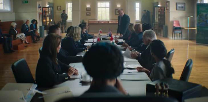Valkyrie, who was left in charge of New Asgard by Thor, appears to be very disinterested as she meets with some other world leaders.